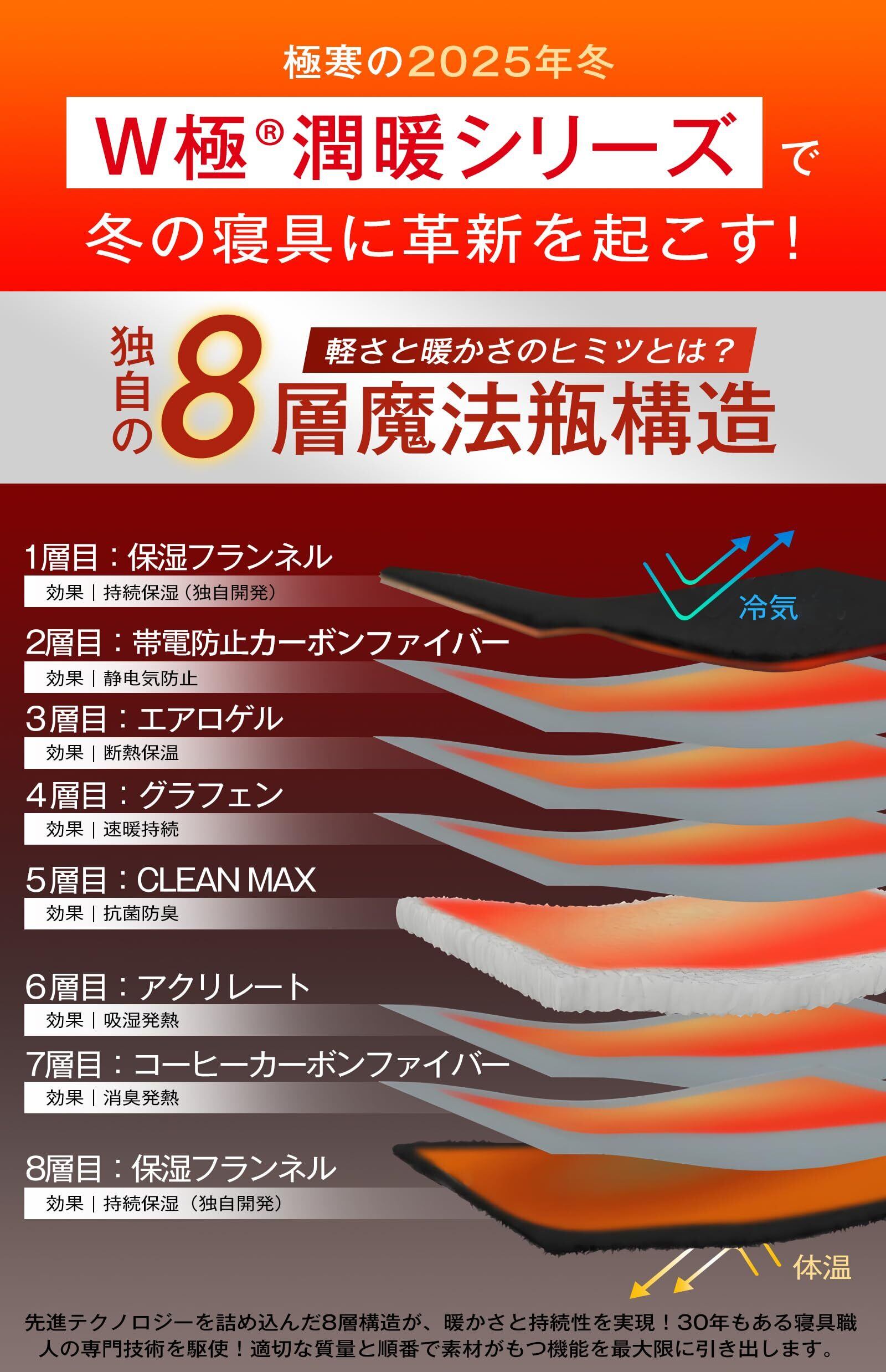【暖かいだけじゃない!潤暖毛布】冬の「暖かさ」だけでなく「肌の潤い」も求めるなら、このW極モイストフレア潤暖寝具で、乾燥や冷えによる肌の悩みを一掃し、6つの先端テクノロジーが届ける「潤いあふれる暖かさ」を体感してください。独自に開発した業界初となる「持続する水分保持フランネル機能生地」が、独自の技術で超保湿成分を分子レベルでナイロン繊維に定着させ、肌に薄い「潤いの膜」をかけるような奢らかな体感をお届けします。さらに CICA 保湿加工を施すことで、ダブルの保湿効果で、肌が毛布に触れる瞬間から、スキンケア成分が肌をしっかり保護し、自生の潤いを逃がさないようキープ。柔らかさが肌に密着するように寄り添い、寝ている間に自然に潤いを補給してくれるため、冬の乾燥によるチクチク感が一掃されます。冬の二大敵「冷え」と「乾燥」、潤暖冬用毛布一つで完璧対策!