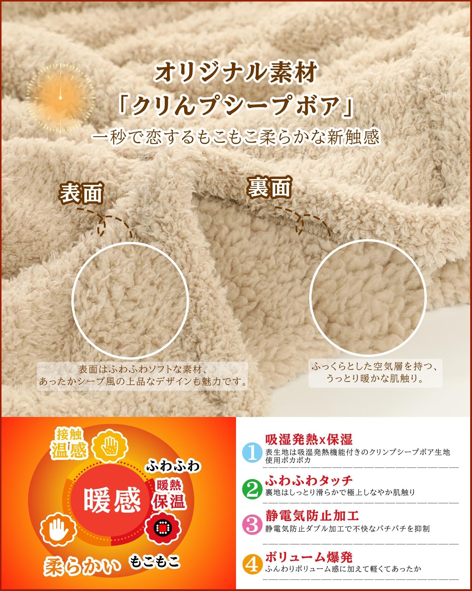 【プラス2.5℃圧倒的な保温性】当社独自のクリンプシープボア生地を使用、抜群の吸湿発熱効果と、しっとりで滑らかな肌触りを兼ね備え、まるで毛布に包まれているような安心感を提供します。保温性は普通のフランネル生地の商品よりプラス2.5℃!冬の季節にぴったりなぬくぬく着る毛布です。【着ればすぐにポカポカ】着る毛布は吸湿発熱の素材を使用しているので汗や湿気を熱に変えて保温性が高く、暖かさをしっかりキープできます。暖房をつけなくても過ごせる日が増えます。ゆったりサイズなので男女兼用で着用できます。家族みんなで使えば、暖房を付けずに過ごせる日が増えて電気代の節約にも繋がります。つい、うたた寝しちゃっても大丈夫です。【一秒で恋するもこもこ柔らかな新触感】やみつきになるふわふわ柔らかな肌触りを実感できます。肌寒さを感じるようなとき、さっと羽織って寒さをしのげて、ずっと触れていたくなるほわほわモコモコ感!