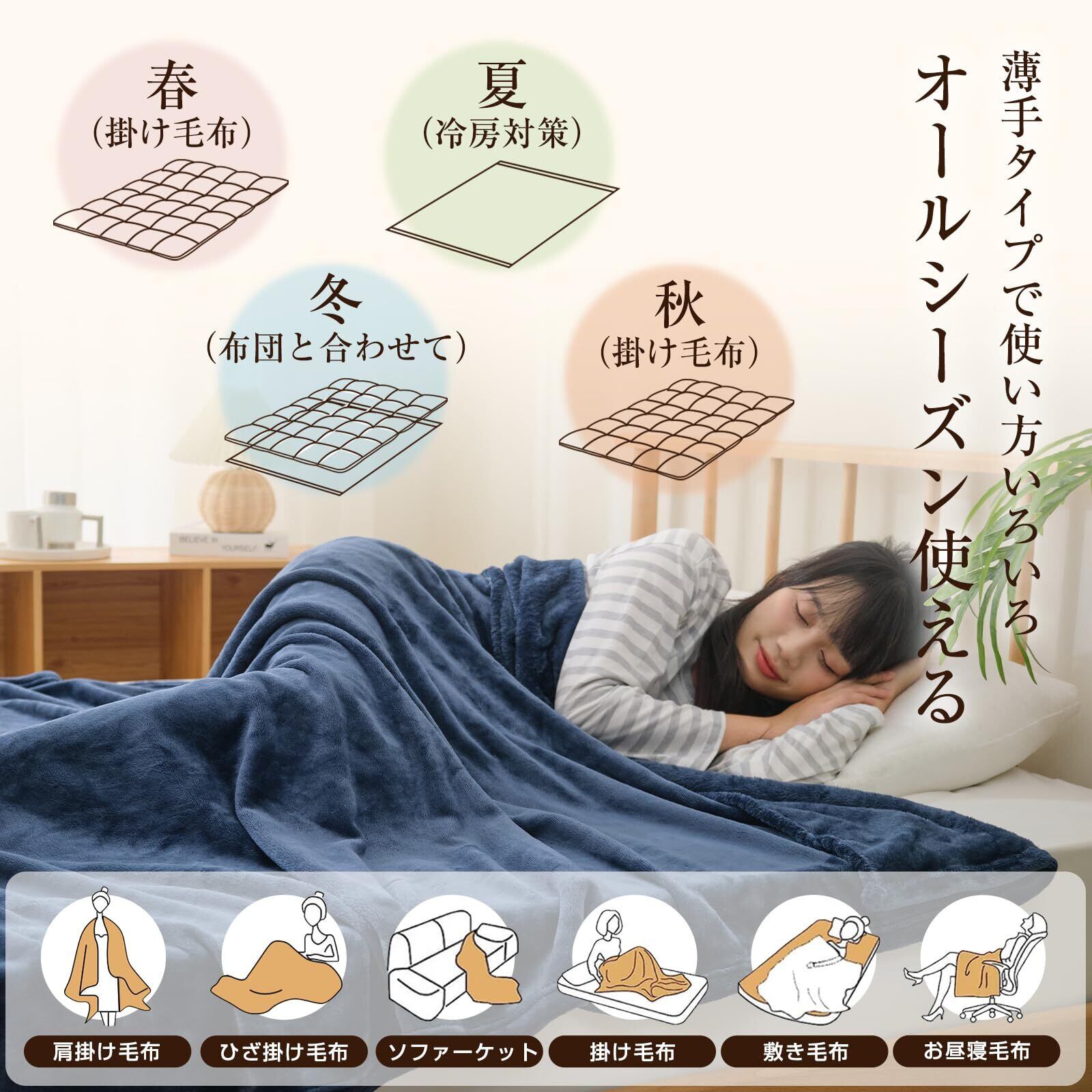 【多用途・年中通用】様々なシーンに活躍!ひざ掛け、肩掛け、掛け毛布、敷き毛布などとして活用でき、この毛布は12〜28度の環境での 冬は毛布と掛け布団を組み合わせて、春先などは毛布1枚で、暑い季節はエアコン対策ブランケットに、1年中活躍してくれる毛布です。軽いから持ち運びやお出かけにも便利です。運転、 旅行、オフィス、キャンプなど幅広いシーンで活躍します。