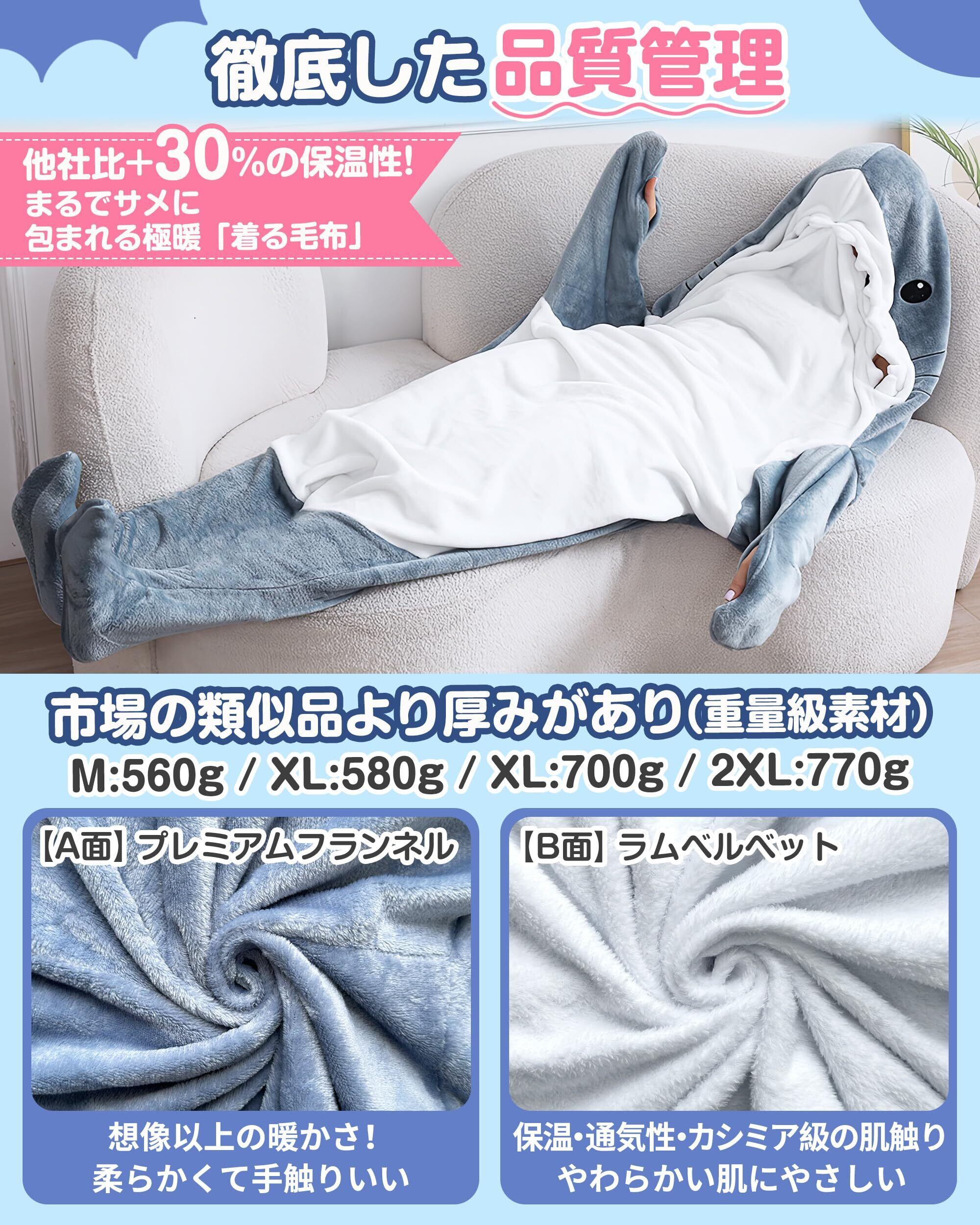 【ユニークで温かいサメ型寝袋の特徴について】 当製品は、快適な使いやすさと保温性を追求したサメ型の寝袋です。❶袖部分は開放型デザインのため、手を自由に出し入れできます。❷フードにはボタン開口式を採用し、サメの襟がずり落ちないよう改良。細部まで使い勝手を追求しました。❸A面は高品質フランネル、❹B面はラムベルベットの両面使いで、肌触りと保温性を両立しています。❺厚みのある作りで保温性を高めており(M/サイズで560g、XLサイズで580g、XLサイズで700g、2XLサイズで770g)、冬の寒さもしっかり防ぎます。