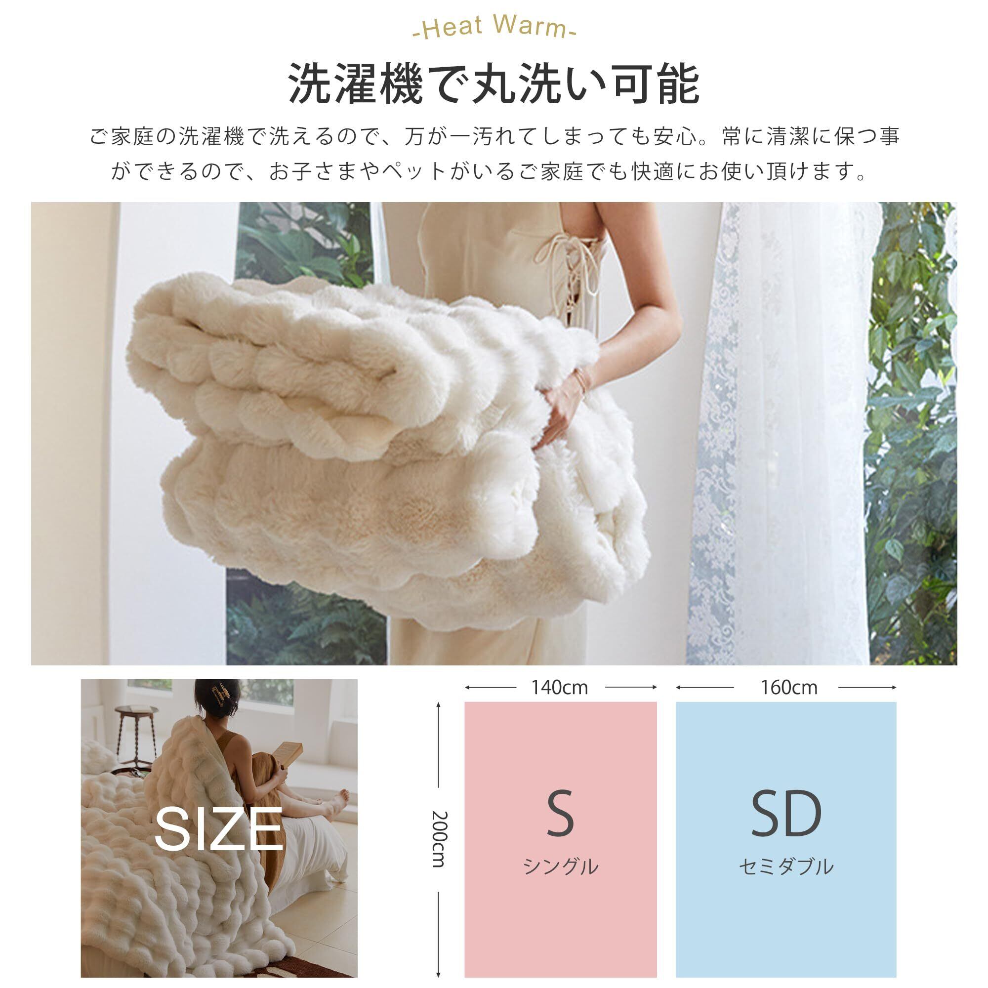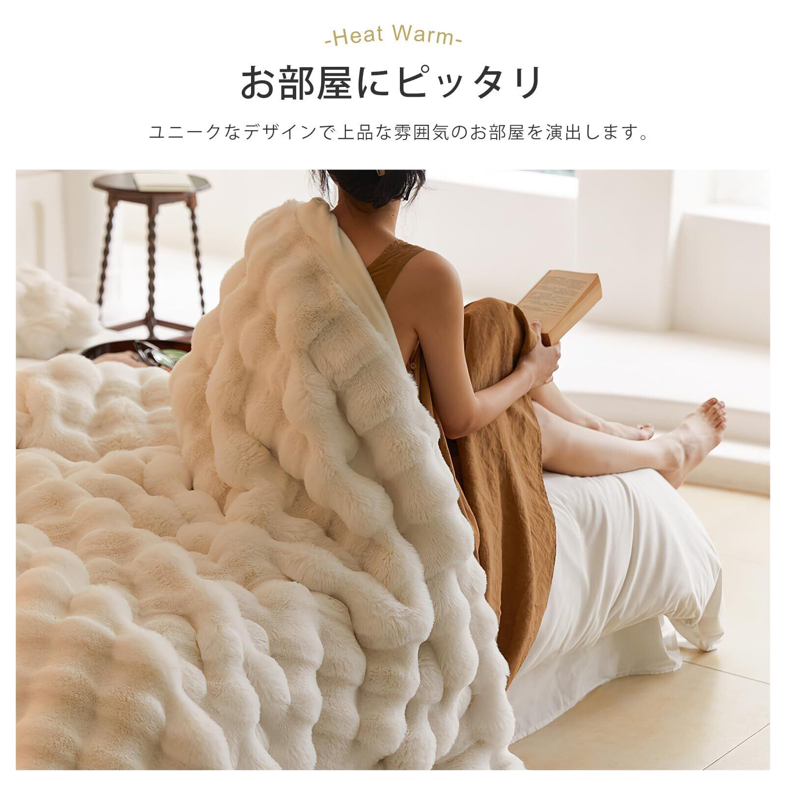 【サイズ・素材】 サイズは160*200cmで、素材にはラビットファー調のフェイクファー生地(ポリエステル100%)を使用。肌に触れるたびに感じる贅沢な柔らかさで、冬の寒さを快適に乗り越えられます。