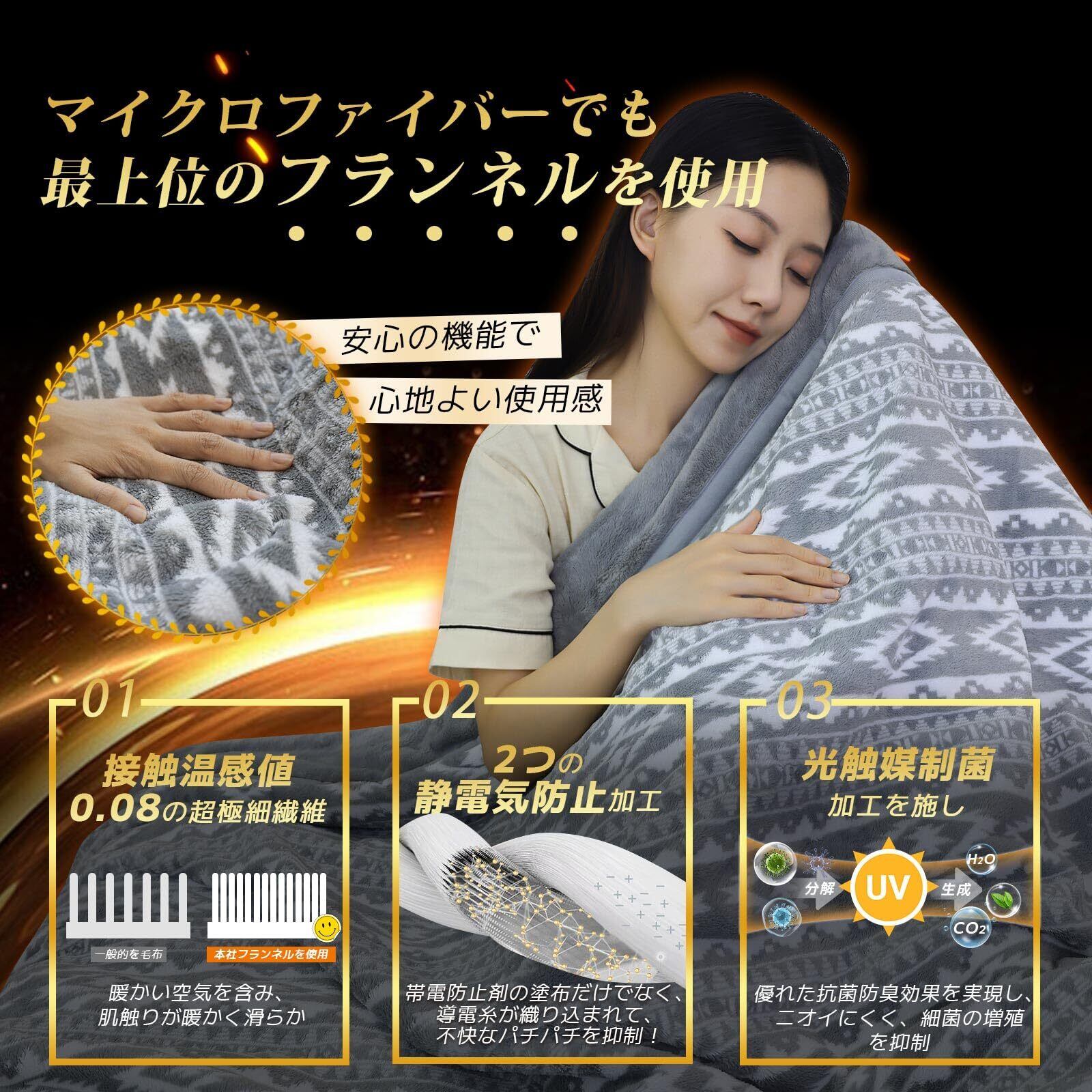 【安心の品質:抗菌防臭&洗濯可能】毛布の表裏生地は光触媒制菌加工を施して、優れた抗菌防臭効果を実現しました。汗をかいてもニオイにくく、細菌の増殖を抑制し、心地よい使用感を維持することができます。ご家庭で気軽に洗濯できます。速乾性に優れているので、洗ってもすぐに乾き、いつでも清潔にお使いいただけます。【品質】当店は日本の会社です。製品は日本国内で企画を行い、国際基準ISO9001認定を持つ中国工場で生産します、安心的な品質ができます。過剰包装を防ぎ環境を保護するため、製品は半圧縮包装されています。開封後は商品を広げて置いたり洗ったりすると、製品の折り目やふんわり感が元に戻ります。万が一商品に不具合場合あれば、1年間のをお付けしておりますので、お気軽に当店までご連絡ください。品質と対応は第一だと信じていますので、何卒よろしくお願いいたします。