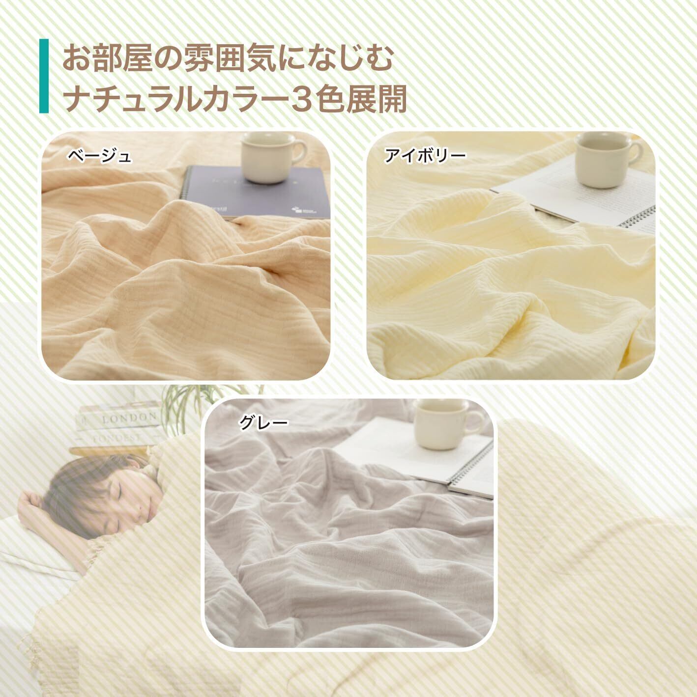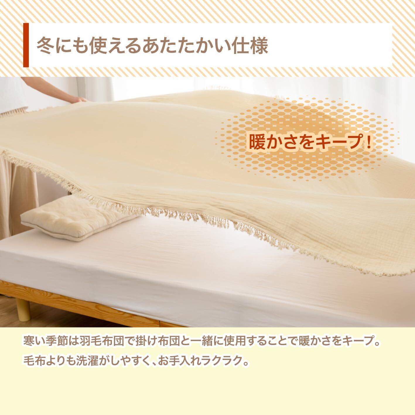 【自然に溶け込む3色展開】インテリアになじむ自然な雰囲気のカラー、ベージュ・グレー・アイボリーの3色をご用意。シンプルながらもフリンジ付きでデザイン性にもこだわったガーゼケットは、寝室やリビングにも自然と調和。冬用のブランケットとしても映えます。