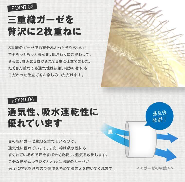 【贅沢な6重ガーゼ】目の粗い3重織ガーゼを2枚重ねて6重に仕上げました。汗をすばやく吸収し、湿気を放出します。