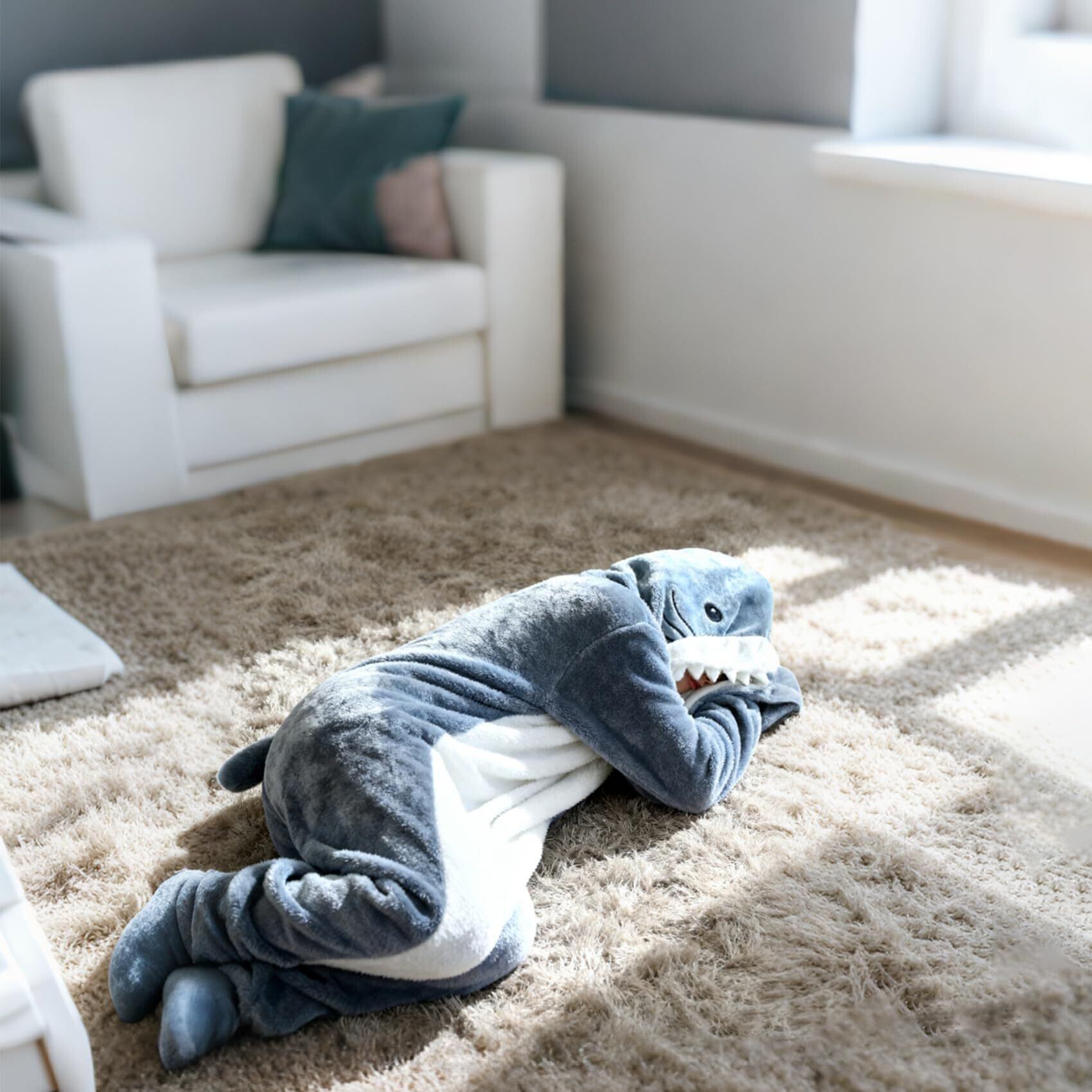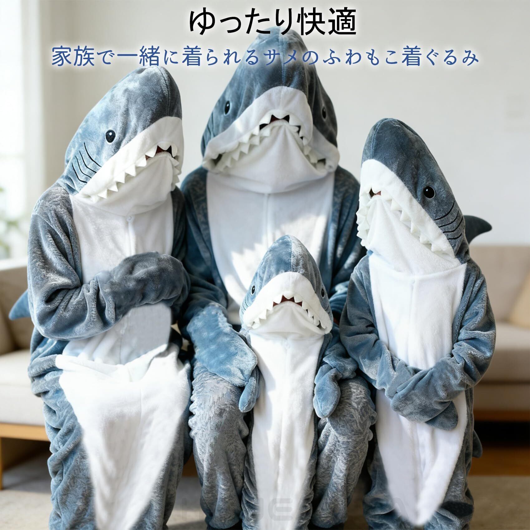 ユニークなサメのフードが特徴的なこの着る毛布は、お部屋の中を楽しい雰囲気に変えます。すっぽり全身を包み込むワンピース型で、冷えやすい季節もしっかり保温。柔らかなフランネル素材が肌を優しく包み、くつろぎの時間を快適にします。 着脱が簡単で、室内での活動を妨げません。親子やカップル、友人同士でお揃いとしてお使いいただけ、共有の楽しさと温もりをお届けします。日常にくらっとしたアクセントを加える、実用的で愛らしい一品です。