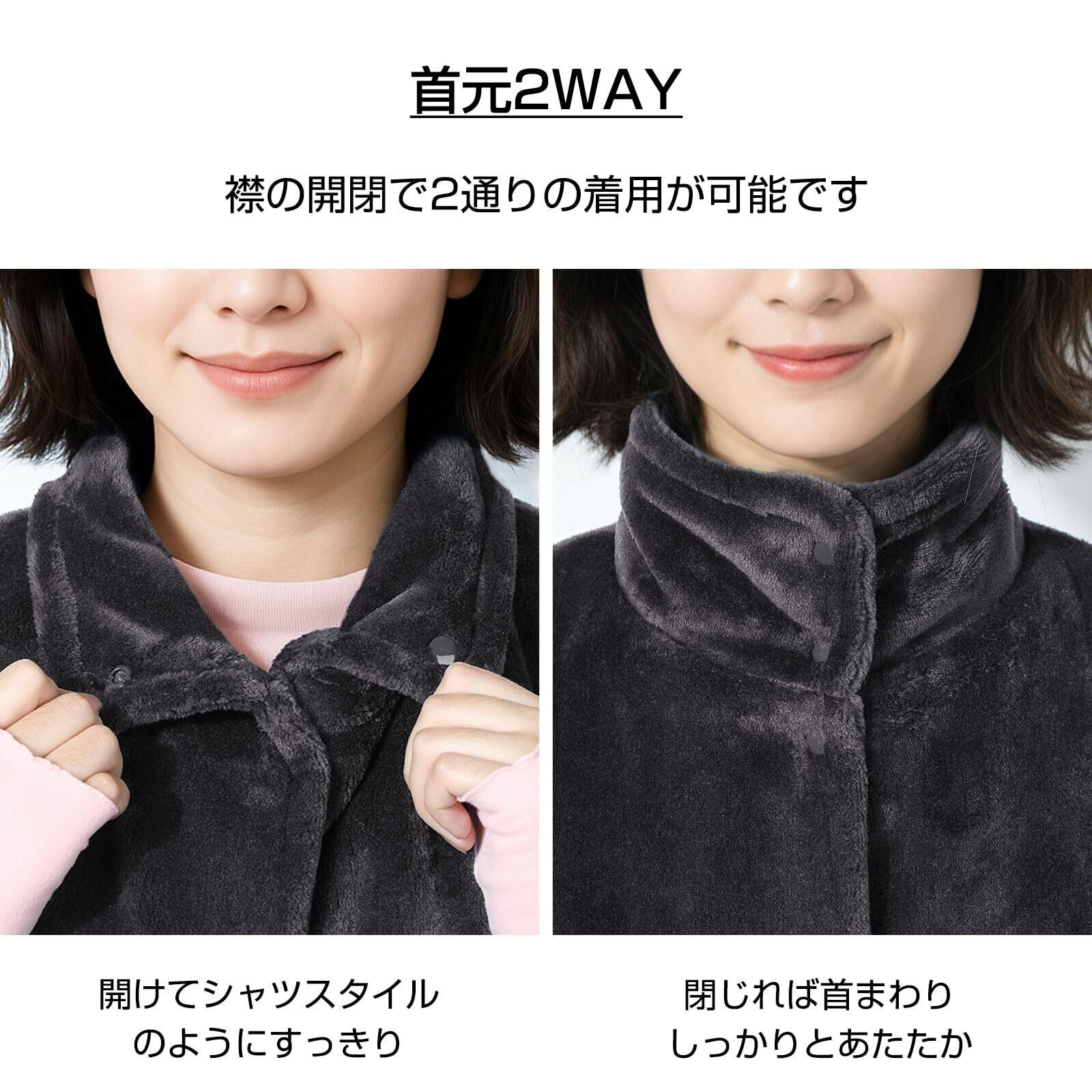 【肩当ての襟元2WAY】ボタンの開閉で襟のスタイルの変更ができます。 ボタンを閉じればハイネックスタイルに首元までしっかりあたたか。ネックウォーマーをしている感覚。ボタンを開ければすっきりシャツタイプに。顔を洗う時や朝のヘアメイクのジャマにもなりにくい。