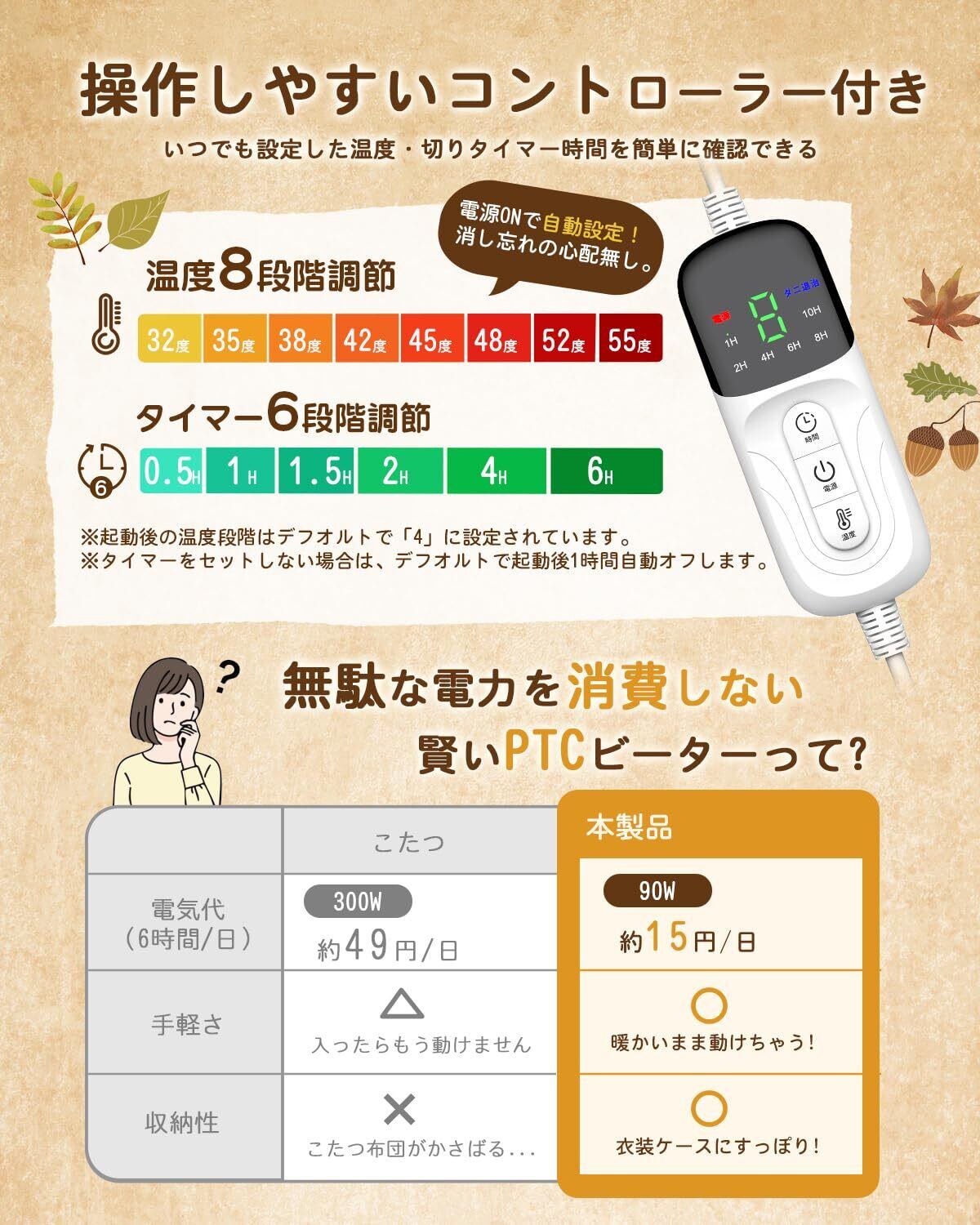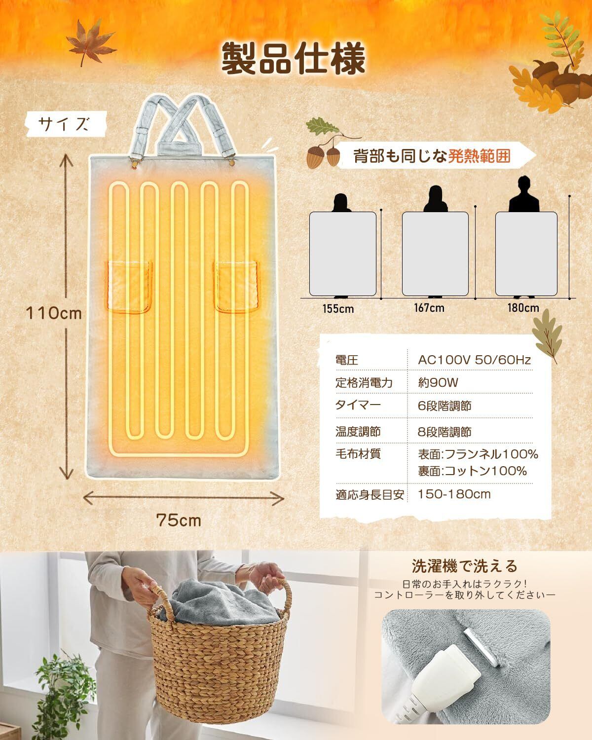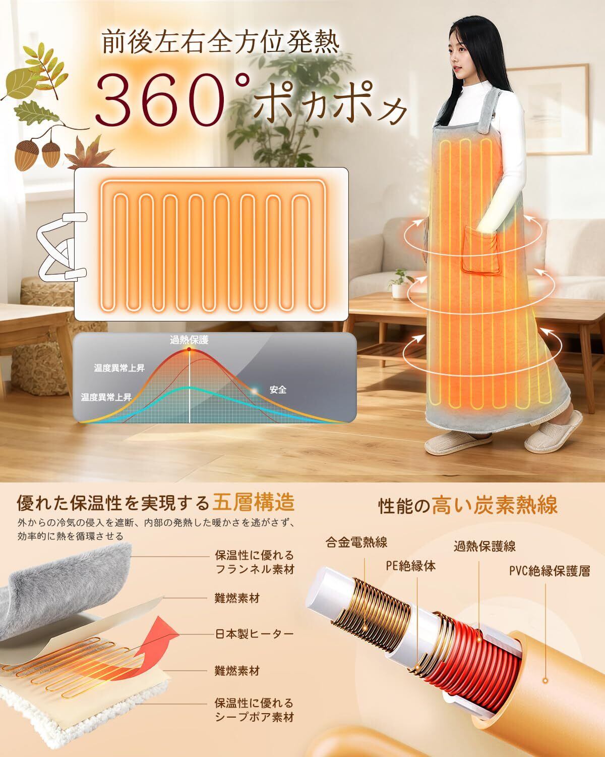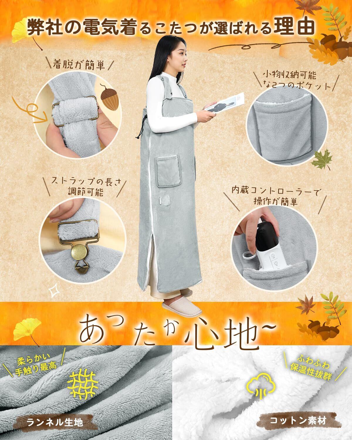 【速暖と安全性を両立・ふわふわ柔らかい肌触り】日本製繊維ヒーターを採用し、熱伝導率が高く、より高速かつ安定に発熱する暖房毛布です。電源を入れてすぐ温まり始め、暖かさが効率よく広がります。5層構造の高密度保温設計により、熱を逃さず、温かい空気をしっかり閉じ込め、まるで着るこたつのようにポカポカが持続します。両面フランネル素材で、柔らかくさわり心地がよくて、折りたたんでもシワになりにくい。電源を使わず、通常のひざ掛けや肩掛けとして普通に使っていても暖かい。防寒対策として、冬の寒さを乗り切るおともにぴったりです。