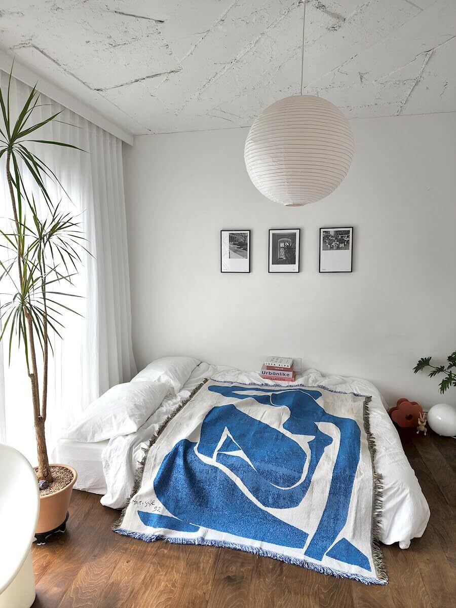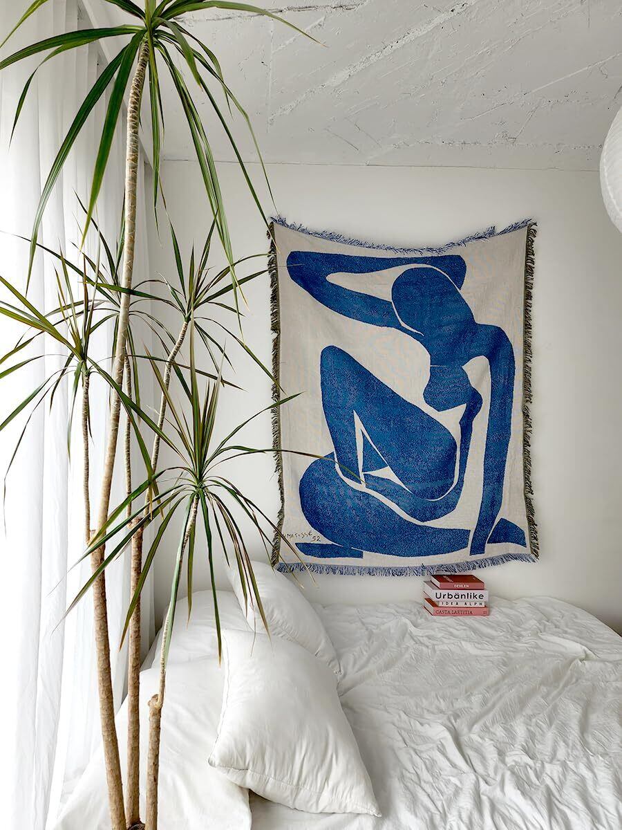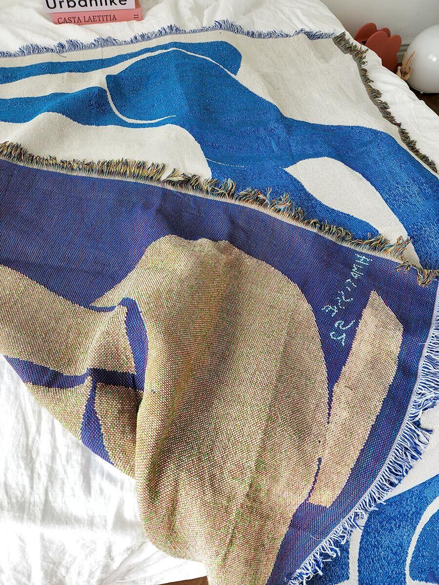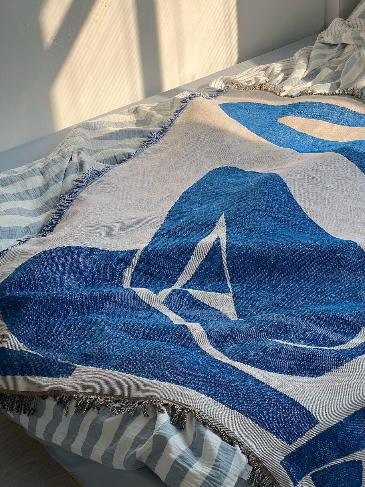 シンプルで少し寂しいと感じるベッドルームのインテリアにおすすめなベッドスロー。 ソファやイスに掛けたり、ラグとしても多様に活用して頂けます。 こちらは19~20世紀に活躍したフランスの画家兼彫刻家、“アンリマティス Henri Matisse ”の作品ブルーヌードのデザインを取り入れたものです。マティスが好きな女性のポーズを切り絵で表現しています。 裏表で色が反転するリバーシブルデザインですので、気分やインテリアに合わせて使い分けて頂けます