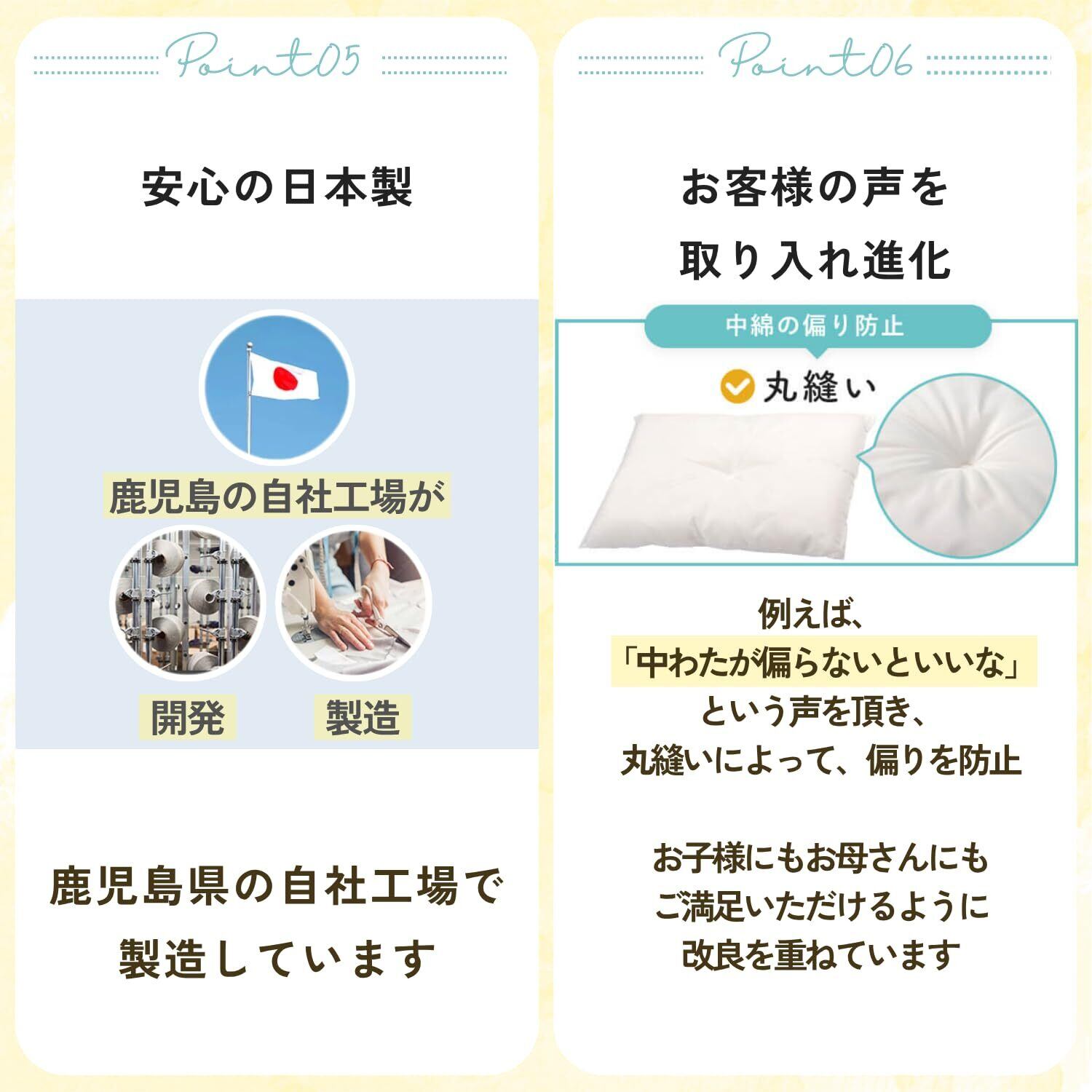 【思いやり枕のポイント】[①首に負担がかかりにくい""低め""の高さ]立っている時と同じような自然な態勢。[②選べる生地の触り心地]お子様の体質や環境に合わせてお選びください。[③しっかり支える弾力性]中身の材料は""ポリエステルわた""。弾力がありながら、ふわっと柔らかくお子様の頭、首、肩を優しく受け止めます。[④丸洗いでOKでいつも清潔]通気性・速乾性の高いポリエステル素材は選択後も早く乾きます。[⑤安心の日本製]製造から、発送までを鹿児島県の自社工場で行います。[⑥お客様の声を]「中わたが偏らないといいな」という声を頂き、丸縫いによって、偏り防止。お子様にもお母さんにもご満足いただけるように、改良を重ねております。