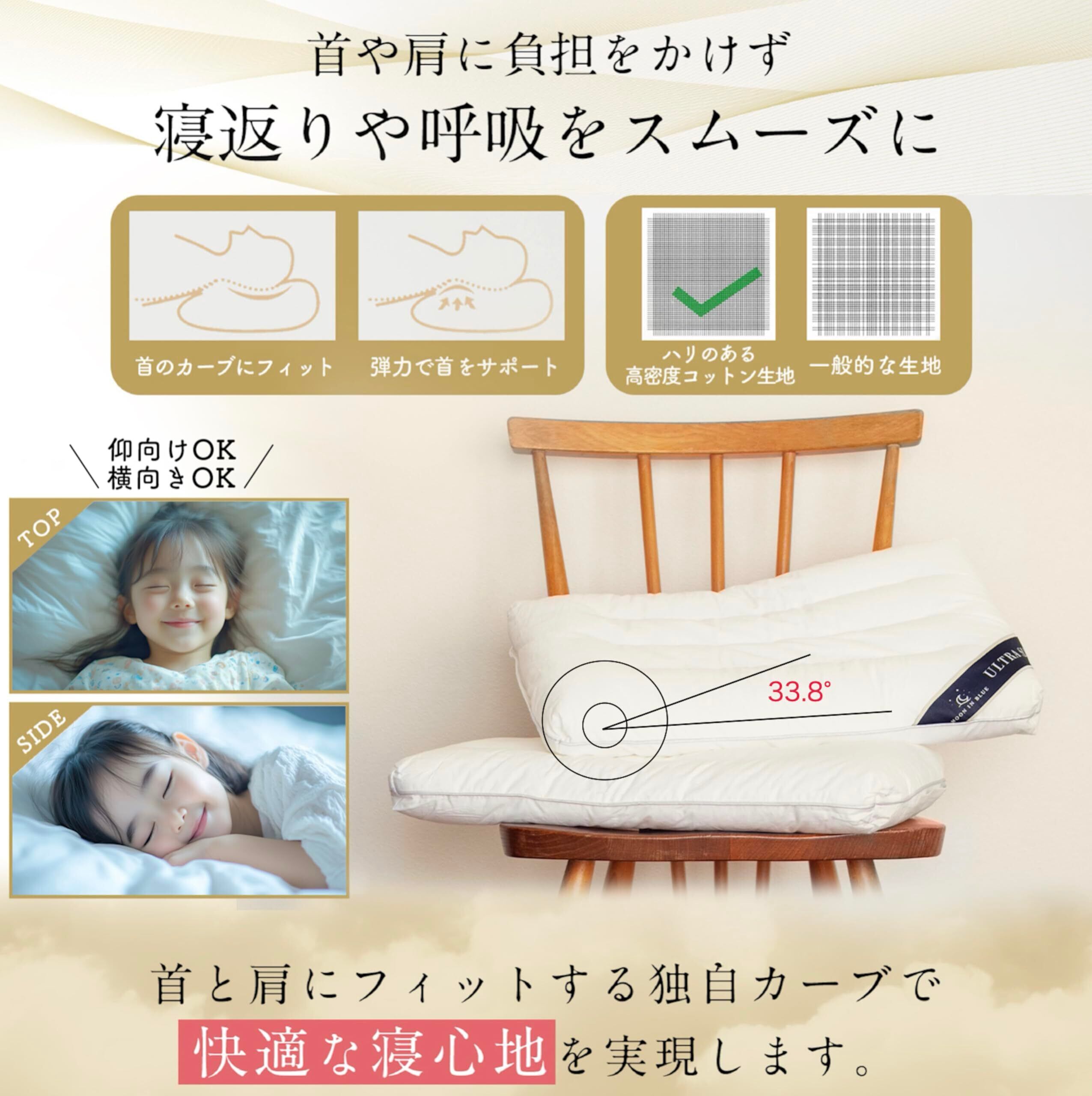 首と肩にフィットする独自の33.8°カーブで寝返りや呼吸をスムーズにします。