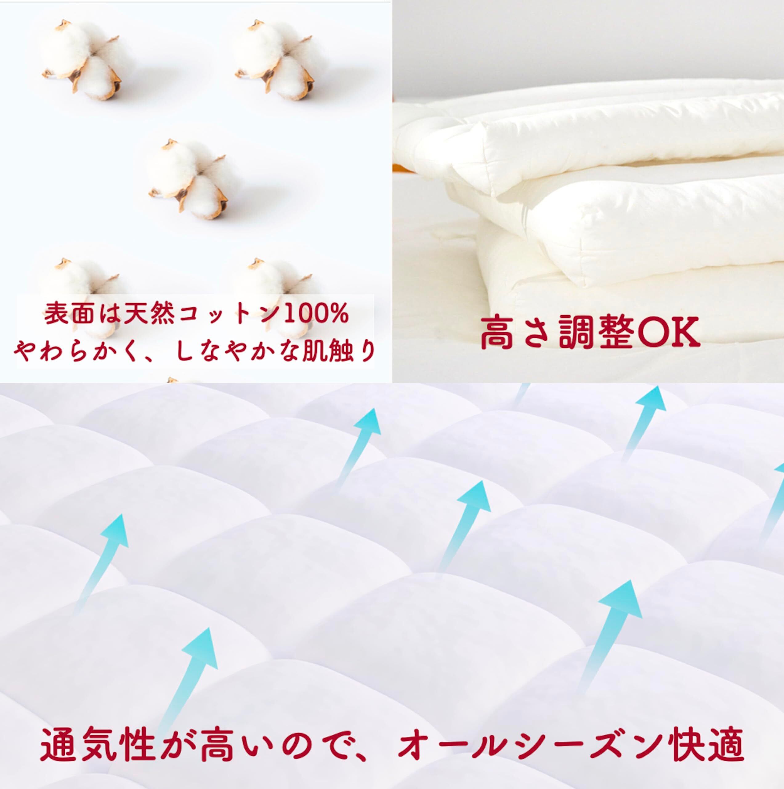 雲の上のようにふんわりなのに高弾力 / 表面は天然コットン100%のしなやかさ / 中綿は高弾力ファインファイバーのふんわり感