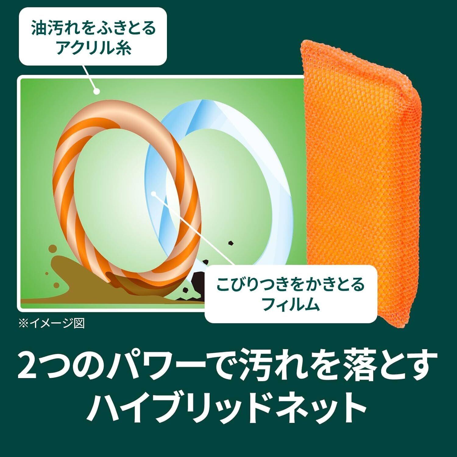 【2つのパワーで頑固な汚れもスッキリ落とす!】2種類のネットが油汚れを拭き取り、こびりつき汚れをかき取るハイブリッドネットスポンジ。しつこい汚れやヌメリがラクに落とせます。