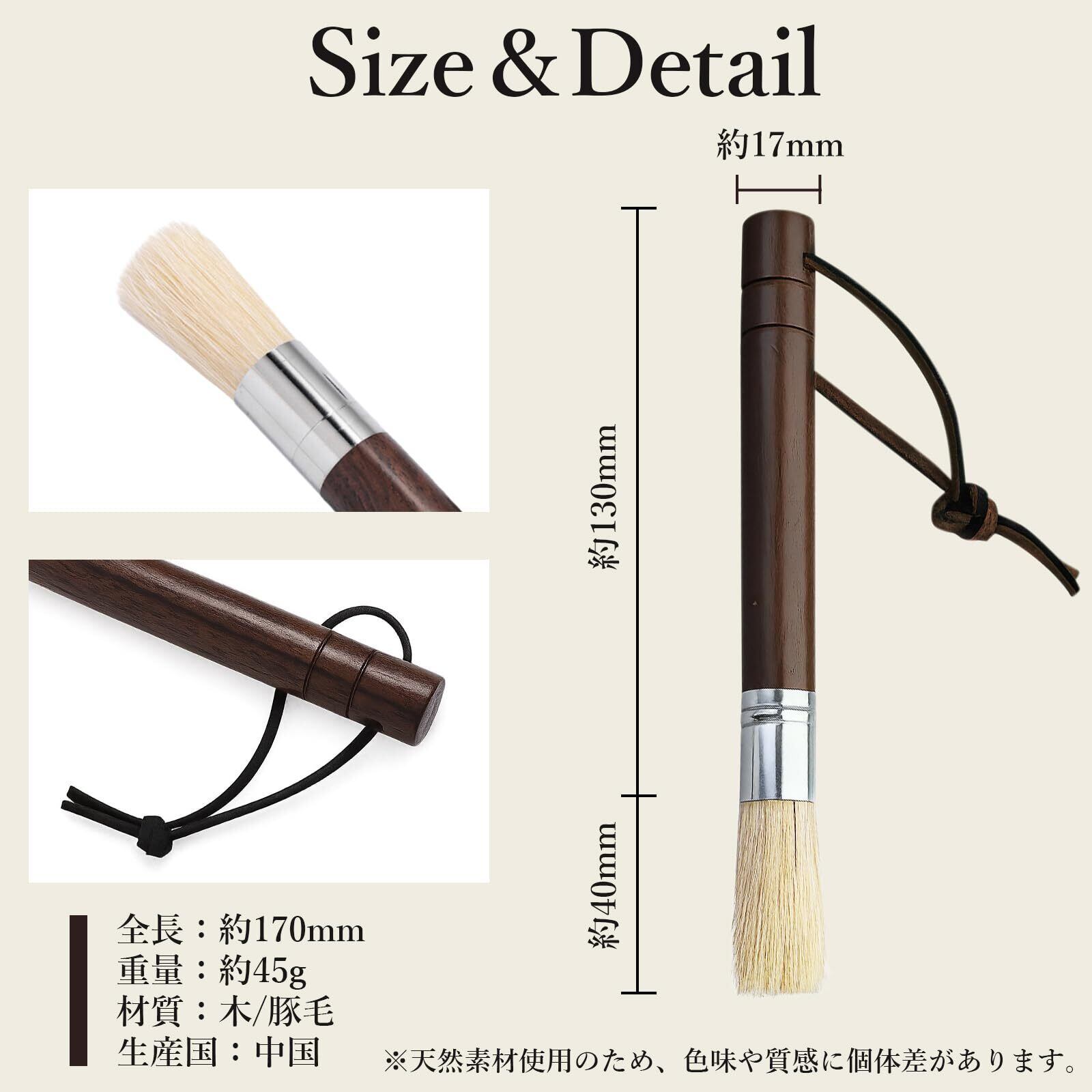 サイズ(約):全長17cm(ブラシ部分4cm 持ち手部分13cm) 重さ(約):45g 材質:木+豚毛 生産国:中国 ※天然の豚毛と木材を使用しているため、色や質感などに個体差がある場合がございます。