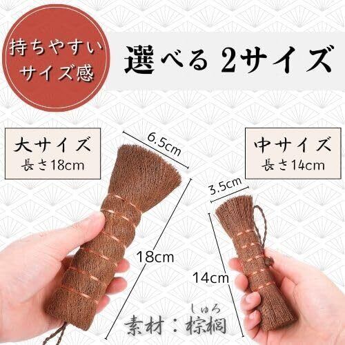 サイズ大(18cm)とサイズ中(14cm)の2サイズをご用意。大と中の2個セットもお選びいただけます。手にフィットする丸みのあるデザインで力が入りやすい設計。和風の見た目でキッチンをおしゃれに演出。天然のシュロ繊維で頑固な油汚れや焦げをしっかり落とします。