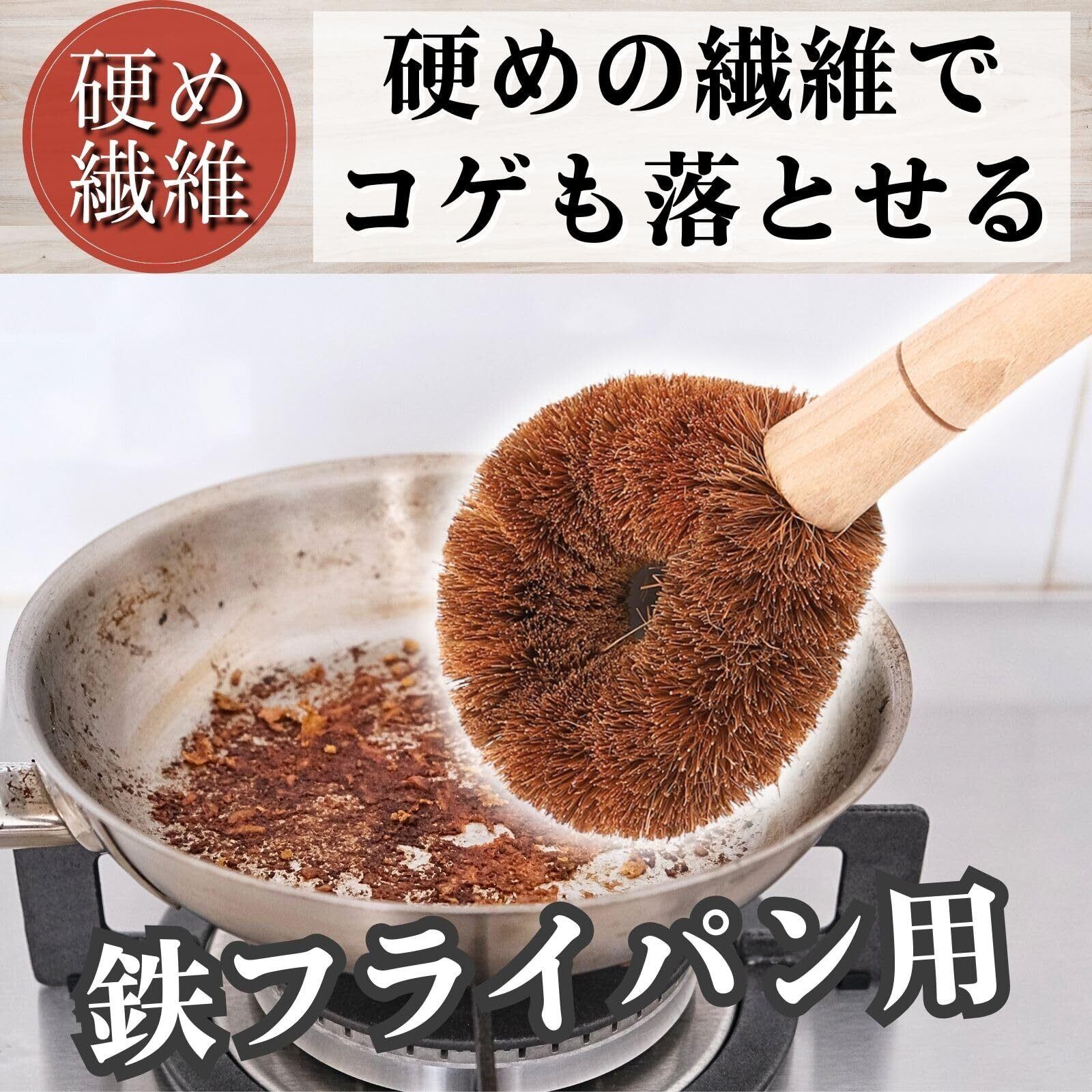 全長は約25cm、たわし部分は約9cmで、鉄フライパンや鍋の洗浄に最適なサイズ感。天然素材のココナッツファイバー(ヤシ繊維)を使用し、木柄には丈夫なブナ材を採用。カラーは温かみあるブラウン。使用前は水洗いを推奨します。洗剤不要で、自然なキッチン掃除が叶うタワシです。