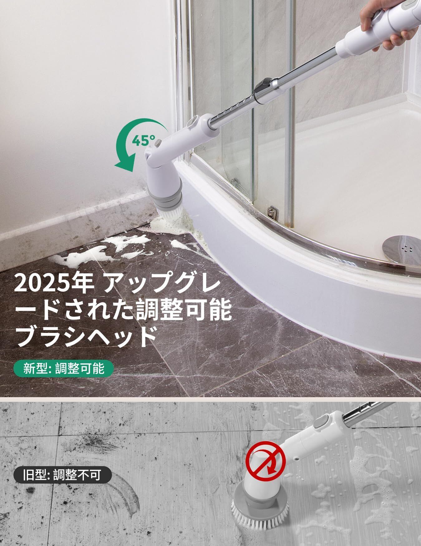 【調整可能なヘッドで、手の届きにくい場所も楽々】 ブラシヘッドの角度が自由に調整可能です。掃除中に無理な姿勢を取る必要はなく、シャワーヘッドの裏や蛇元の隙間など、あらゆる手の届きにくいスポットに自在にアプローチします。