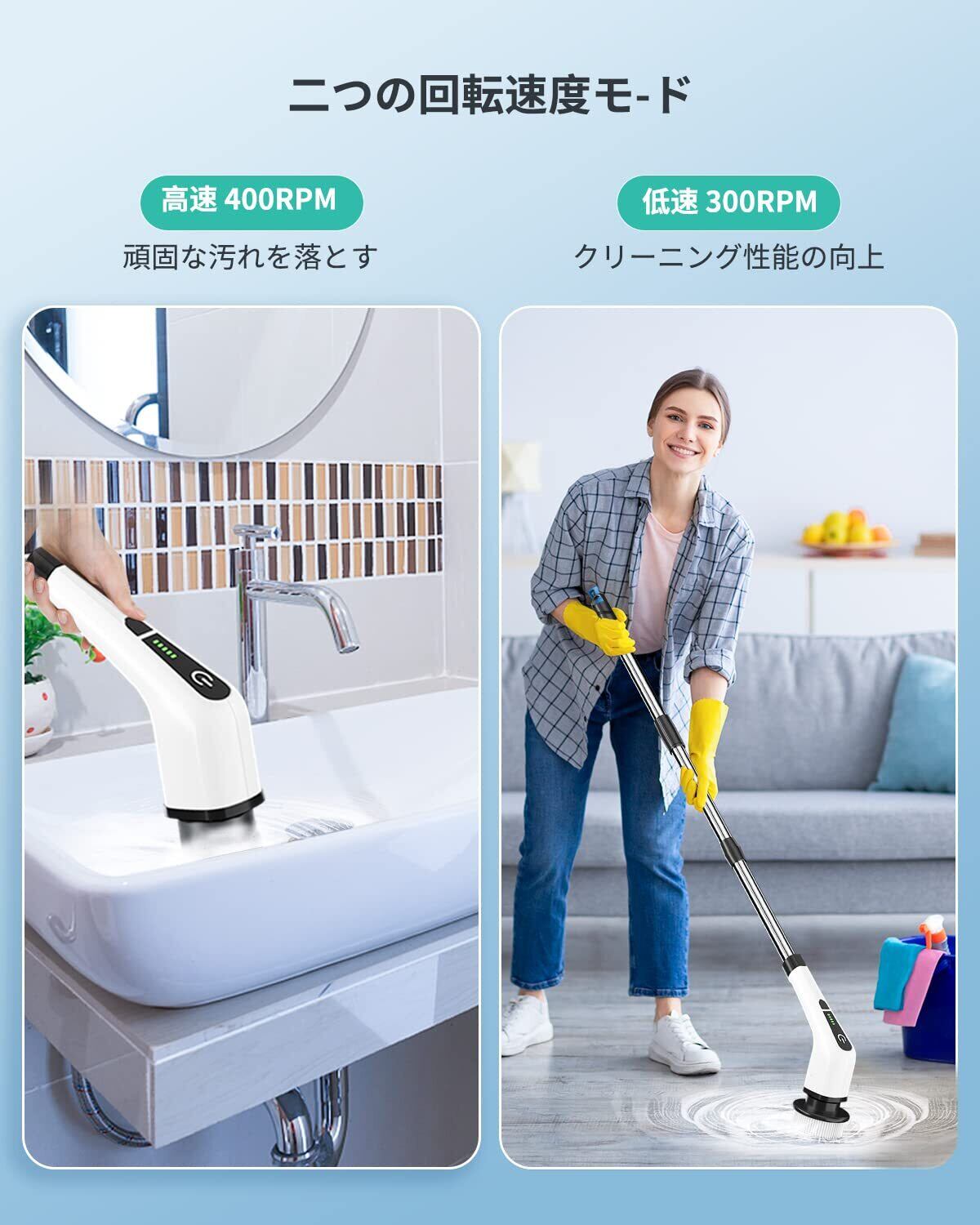 【 二つ回転モード&無線式】電動お掃除ブラシは400RPMと300RPMという2段階の回転速度を搭載し。電源ボタンをオンにして、ボタンを短く押してモードを切り替えます。フロアバスルームクリーナーを使用してください 頑固な汚れでも簡単に取り除き、掃除時間も短縮し、時間を節約できま。そして、電動お掃除ブラシはコードレスの設計で、電線に邪魔せず、どこでも自由に掃除できます。(ご注意:充電中、使用できません)