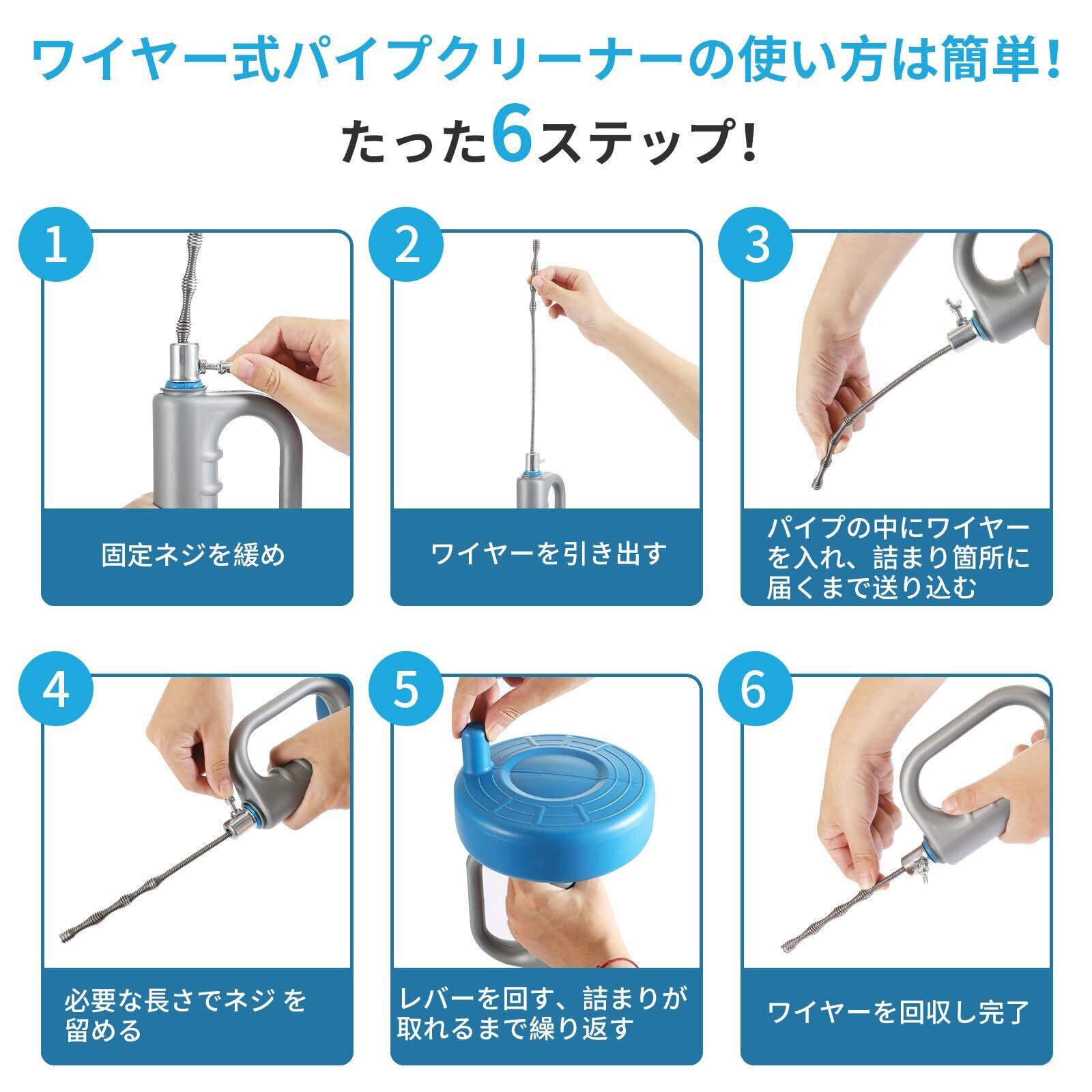 【業者要らず】業者に頼らずに水回りのトラブルを解消できるワイヤー式パイプクリーナー。キッチン、洗面所、お風呂、トイレ、配管、排水管や下水管などの配管やパイプの詰まりにお困りの方は必見です。女性一人でも簡単に使え、配管掃除が楽になります。