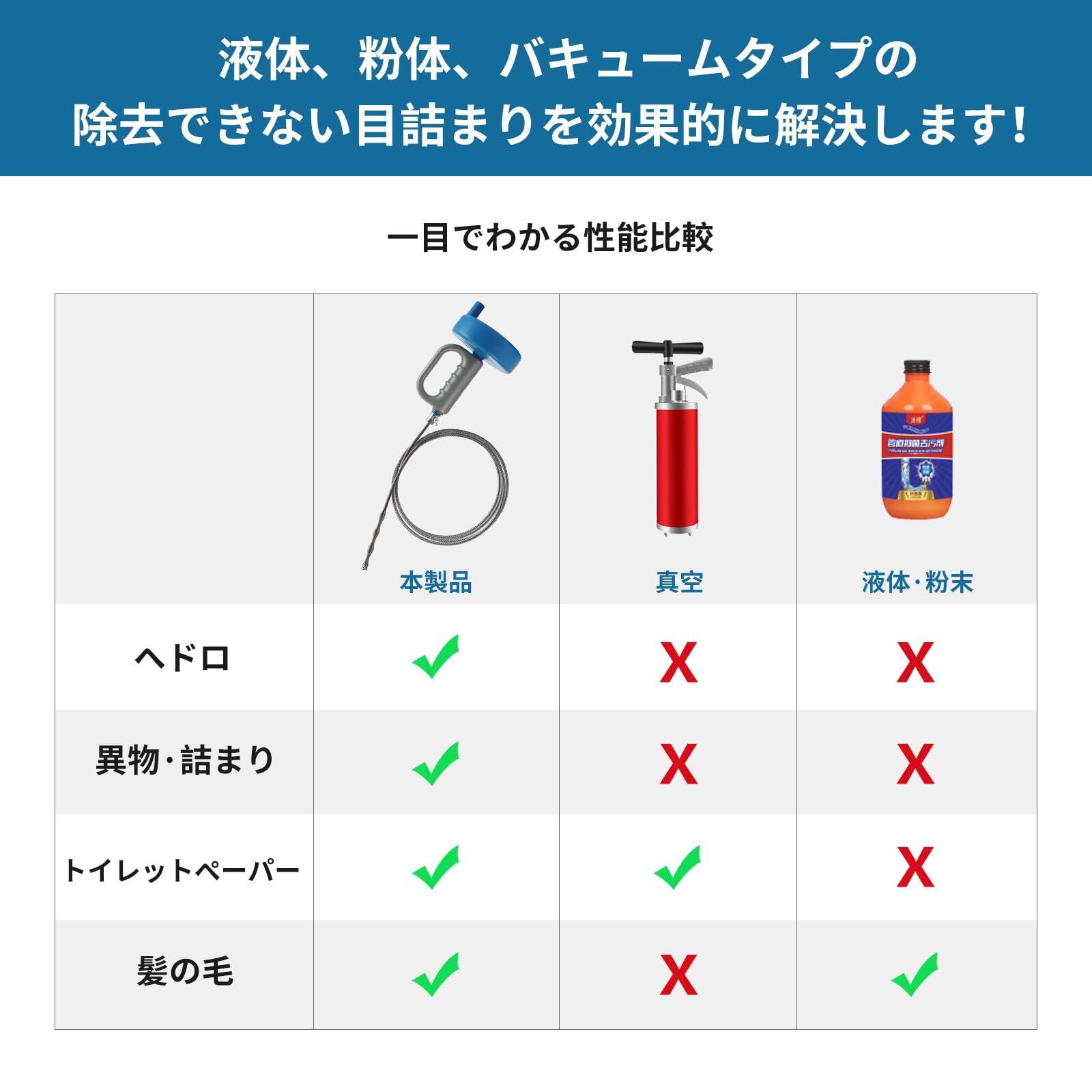 【幅広い用途】回転ハンドルを使用すれば、Sトラップ・Pトラップどちらの曲がった排水溝にも使用ができるので、トイレや洗面所、台所のシンク、床排水用や他のパイプにもお使いいただけます。液体タイプやラバーカップで解消できない詰まりや汚れも、ワイヤーで取り除くことが可能です。