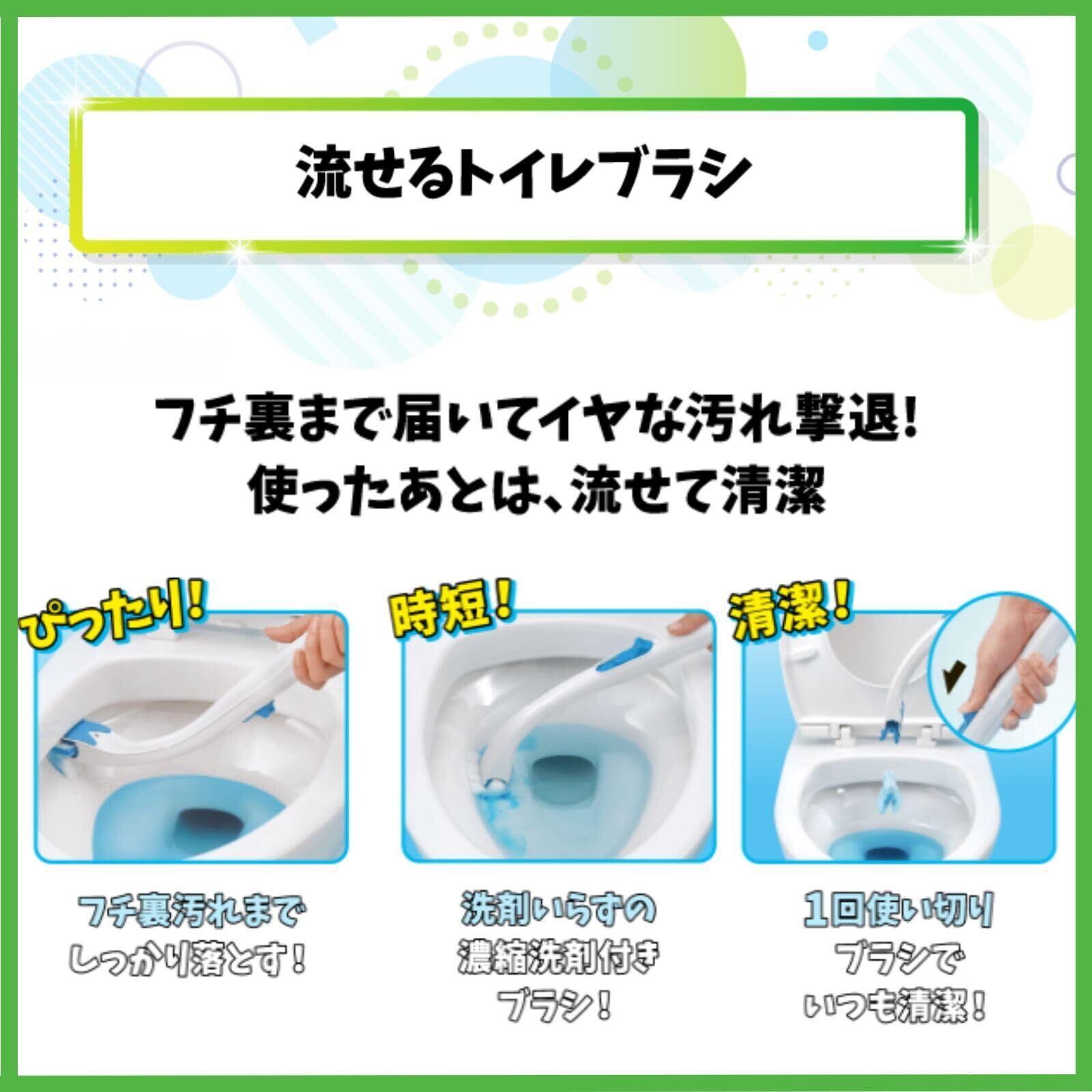 洗剤付きブラシは、トイレットペーパーのように分解する素材でできているので、トイレに流すことができます。 濃縮洗剤付ブラシが、フチ裏汚れまでしっかり落とします。 浄化槽トイレにもお使いいただけます。