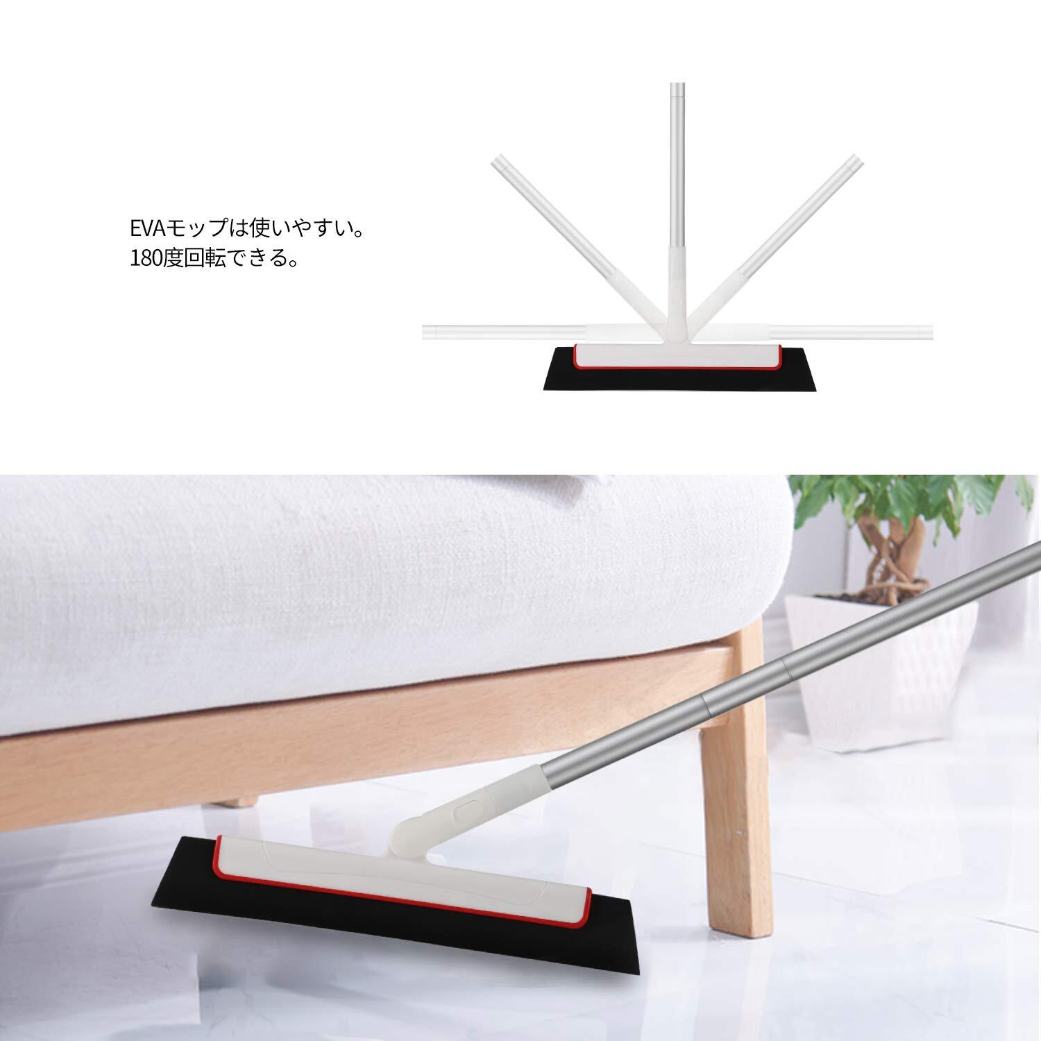 【180°回転できる水切りワイパー】ハンドルの角度は前後に動かさせることにより、ヘッドは0-180°の範囲で調整することができます。狭いスペース、ベッドとソファーの下、椅子と机の脚の間、フローリングの端などもしっかりと拭くことができます。隅々まで綺麗に、角や階段などにもピッタリ。