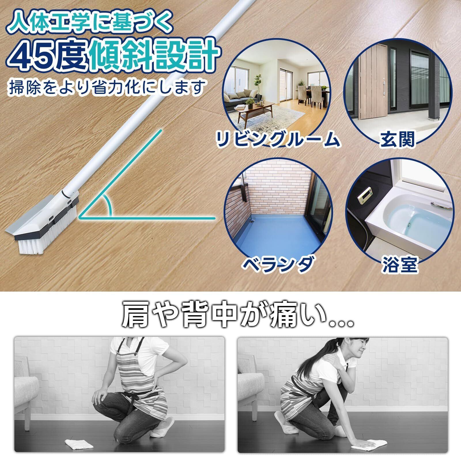 【人間工学に基づいた設計】デッキブラシは人間工学に基づいた45度の傾き設計で、掃除中膝や背中が痛らず、家事をする時の疲れを軽減してくれます。ブラシのハンドルは35cm、75cm、113cmの三段設計で、身長や作業場に応じで長さを調整できます。高い窓や低い床でも手軽く掃除できます。