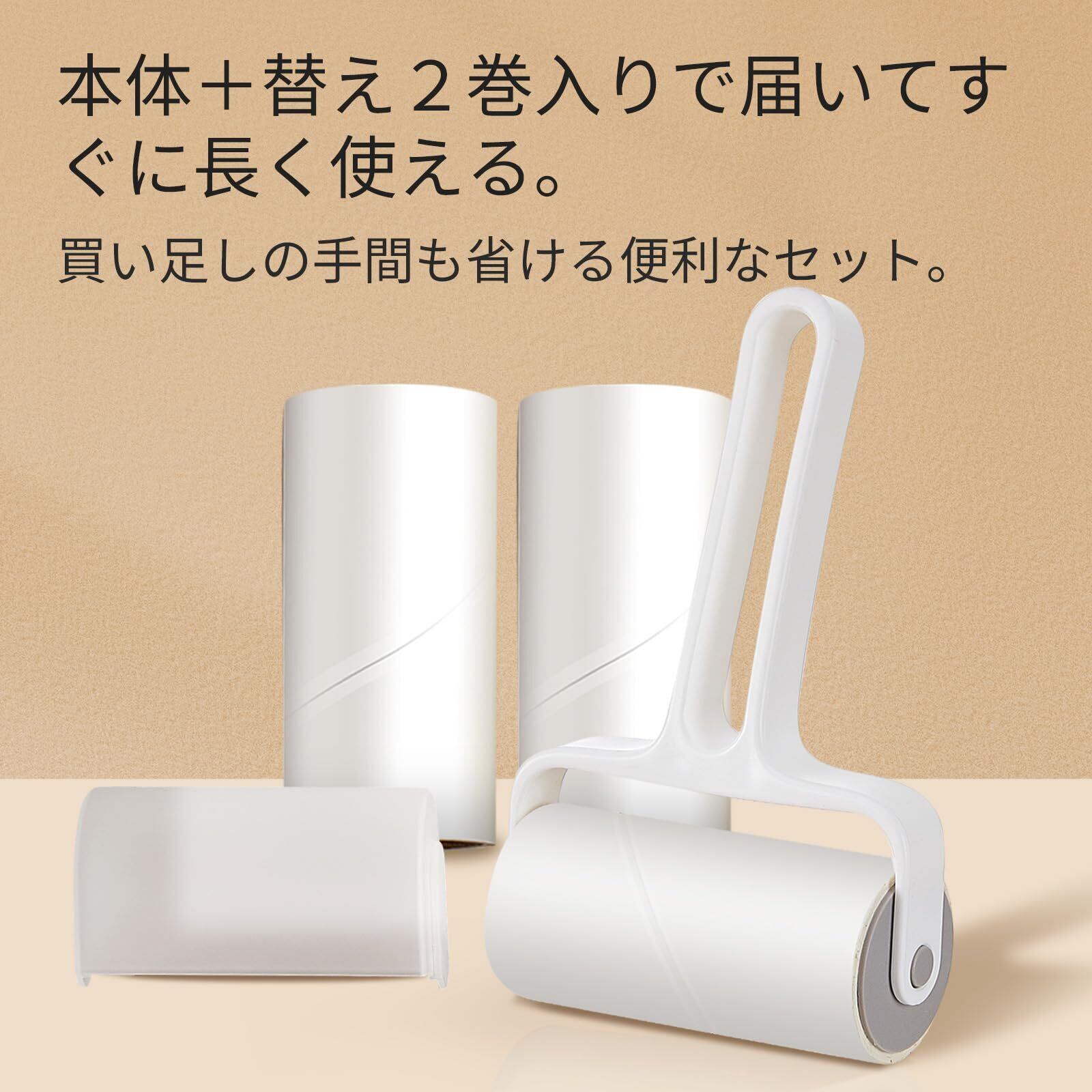【簡単で快適な使い心地】斜めに剥がせるローラー設計で、粘着シートをスムーズに取り外せる。操作が簡単で、無駄がない。交換用芯が2巻に用意されており、長期間使い続けられる。軽量で耐久性のある素材を使用し、長時間の使用でも手が疲れにくい設計である。環境にも配慮した素材を採用し、安心してお使いいただける。