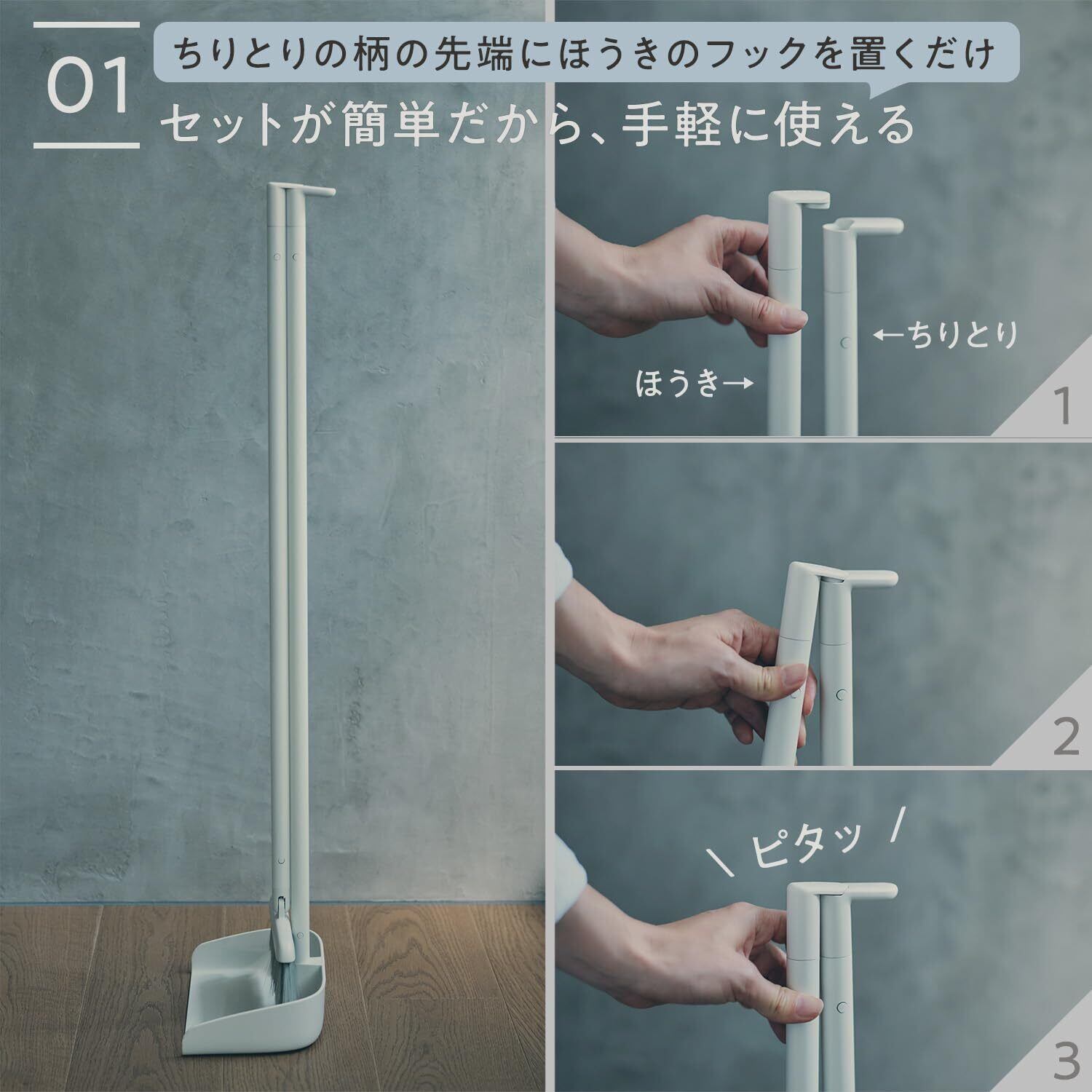 【柄が長くて掃きやすい、立たせてすっきり収納】柄が長く掃きやすいほうきと、ゴミがこぼれにくいちりとりのセットです。ちりとりの柄の先端にほうきのフックを置くだけで簡単に収納できます。