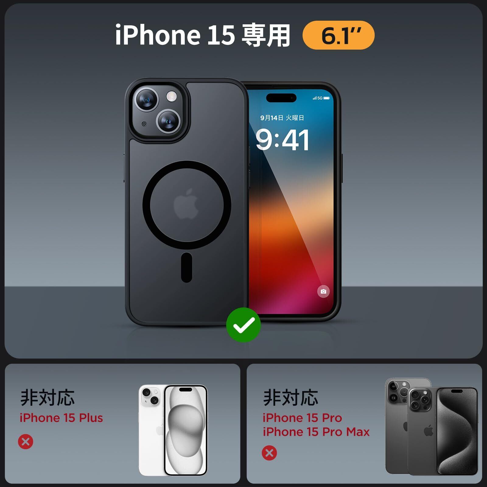Miracase iphone15 ケース【Magsafe対応・MIL米軍規格】iphone15ケース 6.1インチ、耐衝撃iphone 15 ケース、黄ばみ防止、傷防止、指紋防止、放熱、ストラップホール付き、薄くて肌に優しいデザイン、金属ボタン、マット、フロスト、半透明、黒