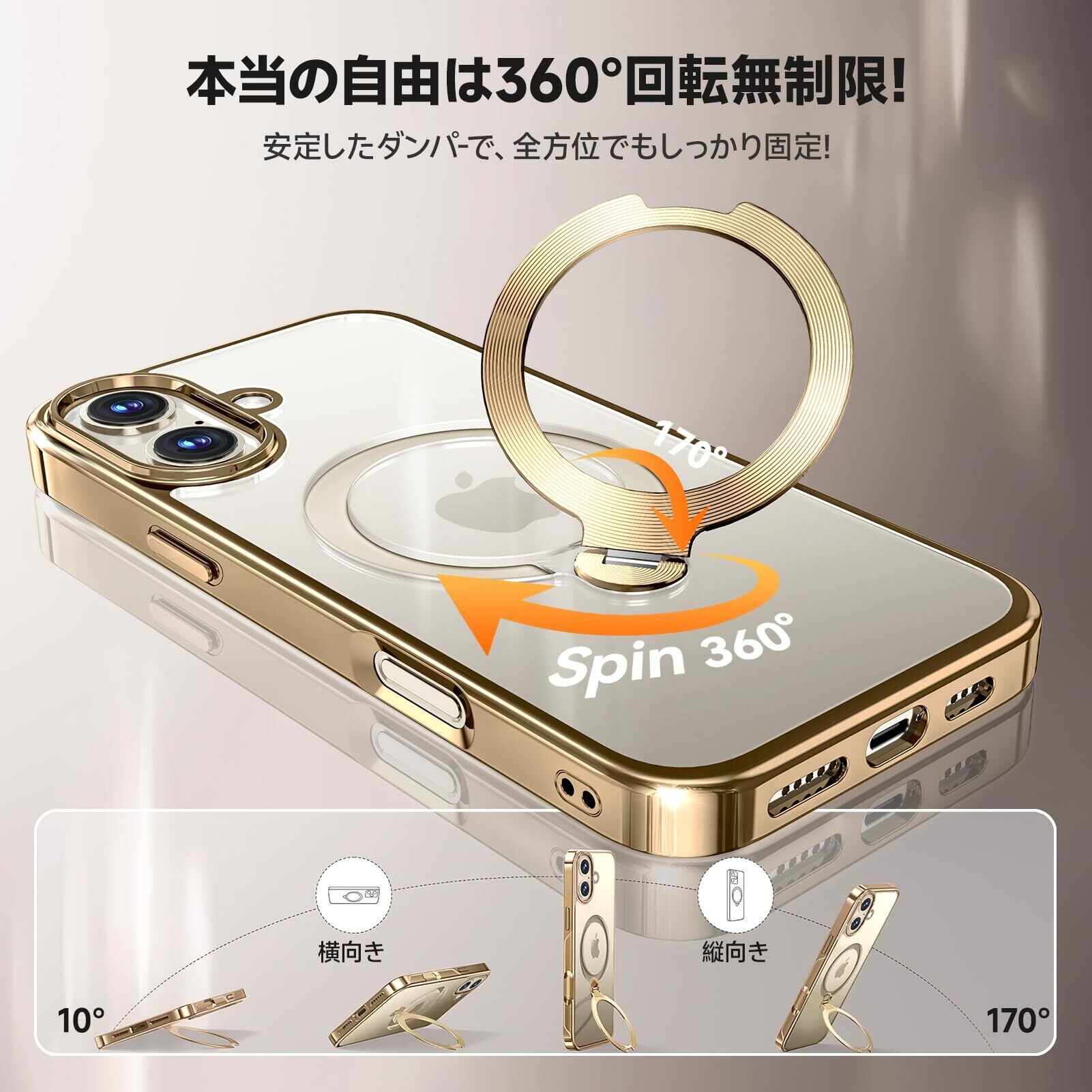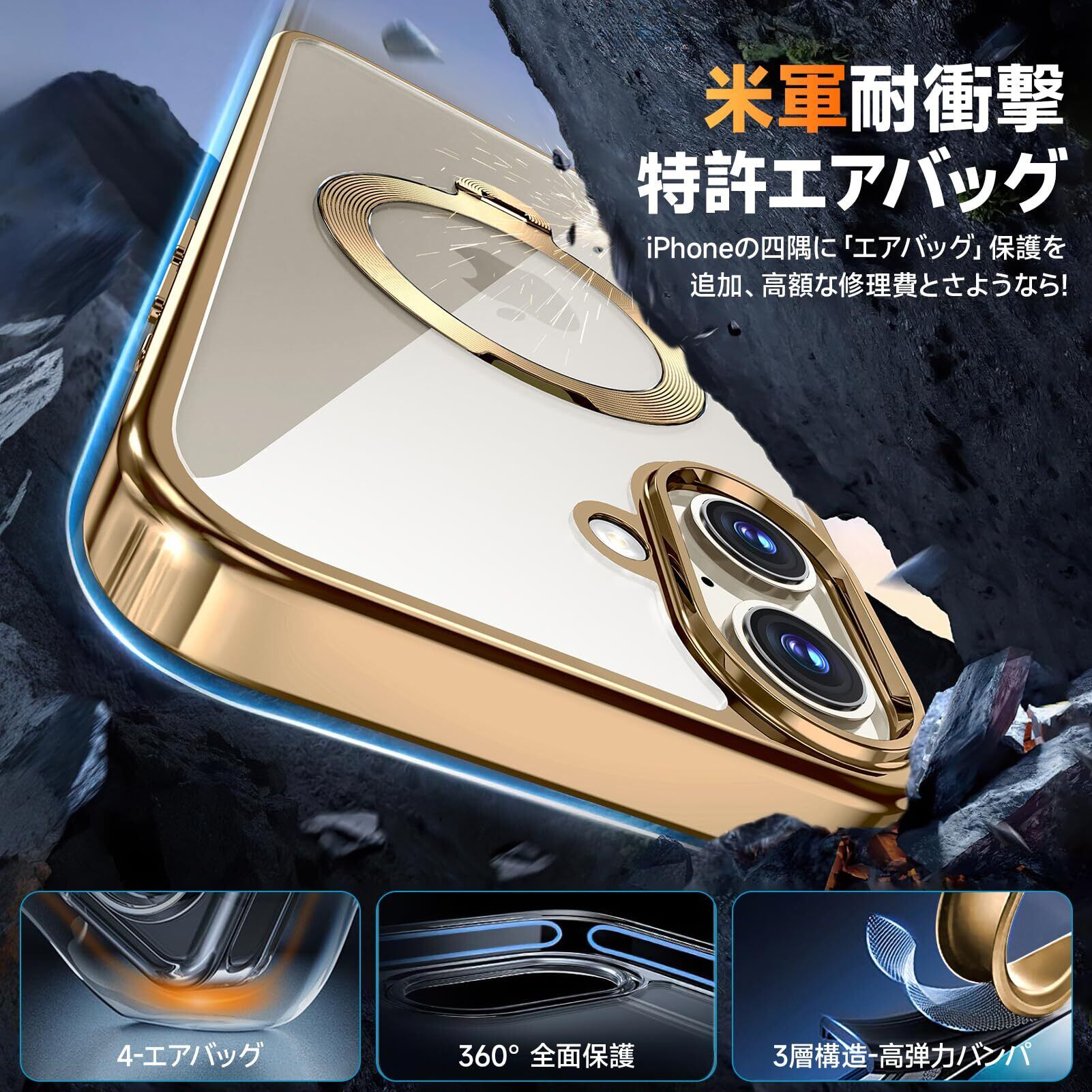 【在庫セール】【三重保護セット!上品なメタリック光沢】OYR iPhone 17用クリア ケース Magsafe 対応[360°回転CD スタンド・10 万回開閉テスト][メッキバンパー・iPhone専属色][カメラ保護とガラスフィルム付き]ストラップホール付き マグセーフ アイホン17ケース マホケース17 人気 米軍MIL規格取得・耐衝撃(6.3インチ・ゴールド)