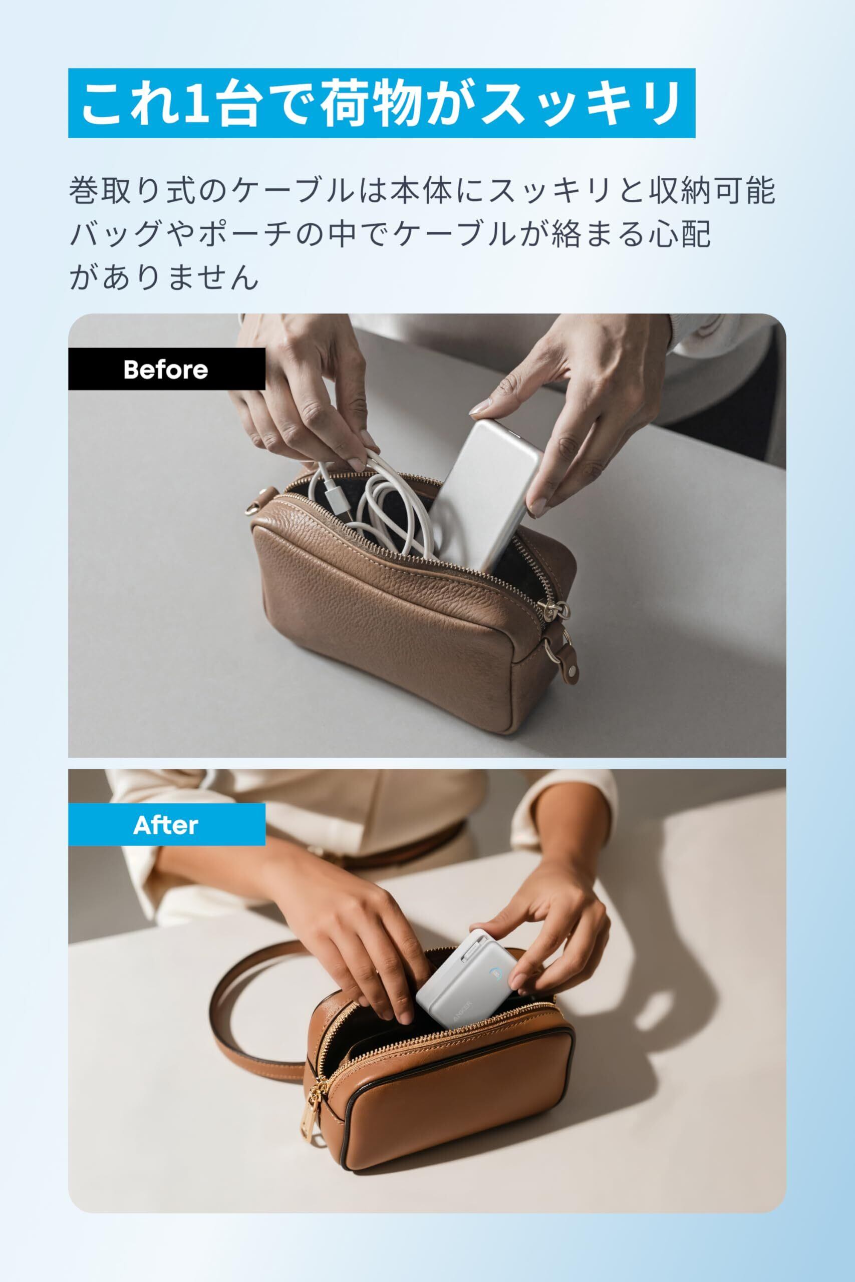 これ1台で荷物がスッキリ:巻取り式のケーブルは本体にスッキリと収納可能です。バッグやポーチの中でケーブルが絡まる心配がありません。