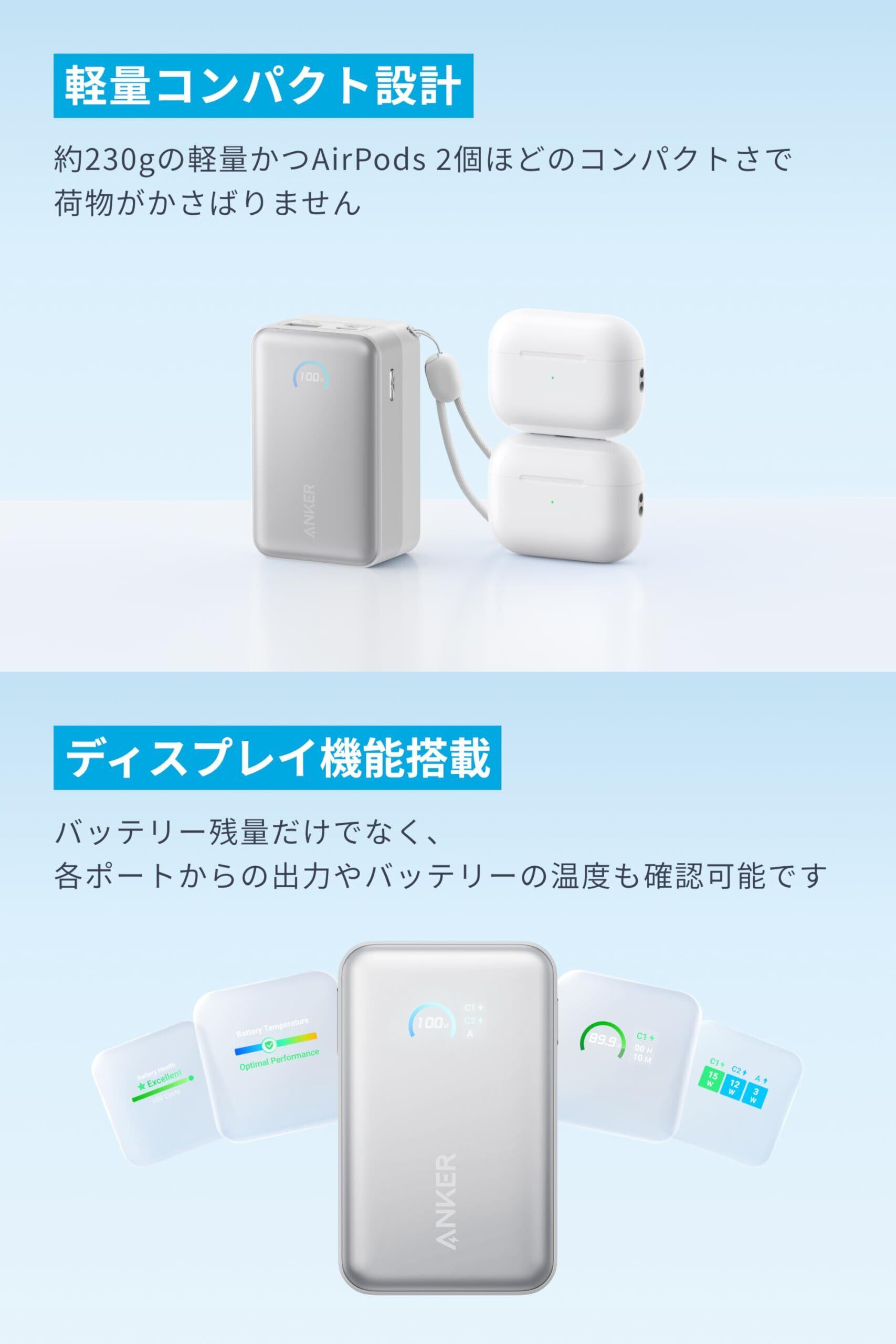 Anker Nano Power Bank (10000mAh, 45W, 巻取り式 USB-Cケーブル) 10000mAh 45W出力 / LEDディスプレイ搭載/USB-Cケーブル一体型/巻取り式ケーブル/iPhone 17 / 16 / 15シリーズ / iPhone Air/Android iPad その他各種機器対応 (ホワイト)
