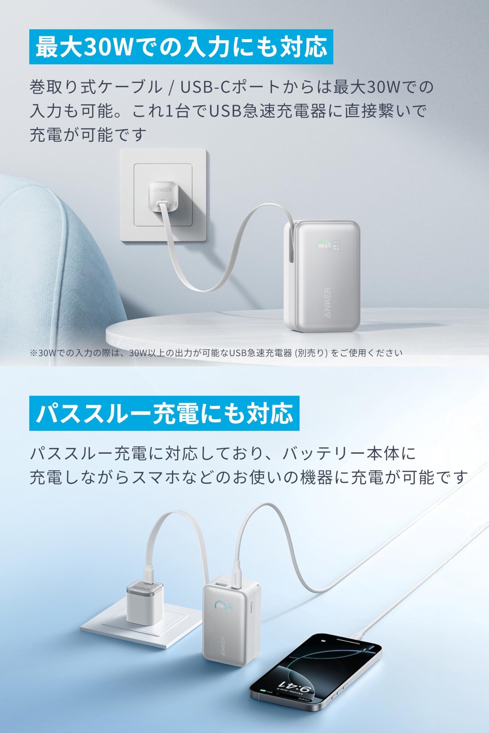 最大30Wでの入力にも対応:巻取り式ケーブル / USB-Cポートからは最大30Wでの入力も可能です。これ1台でUSB急速充電器に直接繋いで充電が可能です。