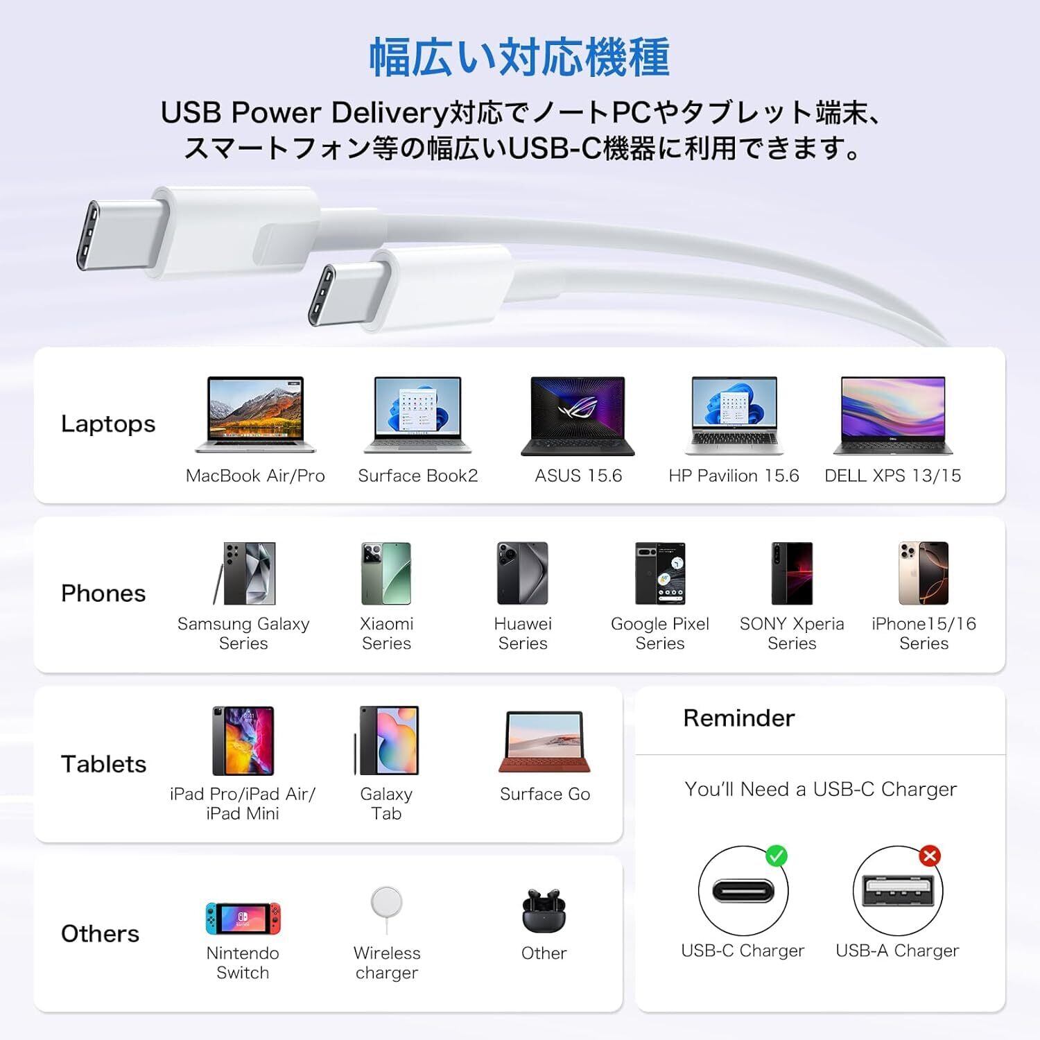 【幅広い互換性】充電器本体はあらゆるUSB-C急速充電対応のデバイスへの充電が可能。ご注意:付属しいる充電ケーブルUSB-C&C ケーブルで、iPhone 16/15のみ対応します。他のデバイスは適応なケーブルで交換してください。