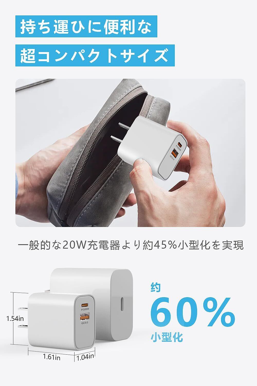 【20W PD高速充電器】:USB-C PD 3.0ポートを搭載したこの充電器は、最大20Wの出力を実現。iPhone 16/15/14/13/12シリーズをはじめ、さまざまなデバイスに超高速充電を提供します。従来の5W充電器よりも3倍速く、電池残量に不安を感じることなく、忙しい日常をサポートして、時間を有効に活用しましょう。
