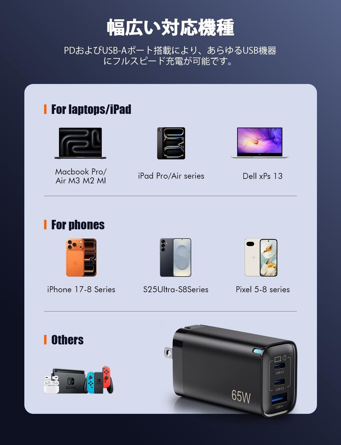【65W急速充電】:USB PowerDelivery(PD)対応の65W出力を備え、スマートフォンからノートPCまで幅広い機器に急速充電できます。MacBook Air 13は約1時間で満充電、従来USB充電器の約7倍のスピード。iPhone15 Plusならわずか30分で50%以上充電可能です。MacBook、ノートPC、タブレット、スマートフォンなど複数のデバイスを同時に充電可能で、複数端末を持つご家庭に最適な65W高速充電器です。
