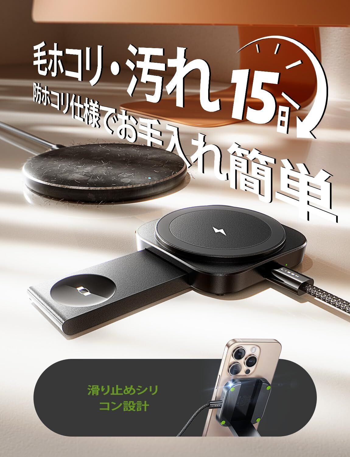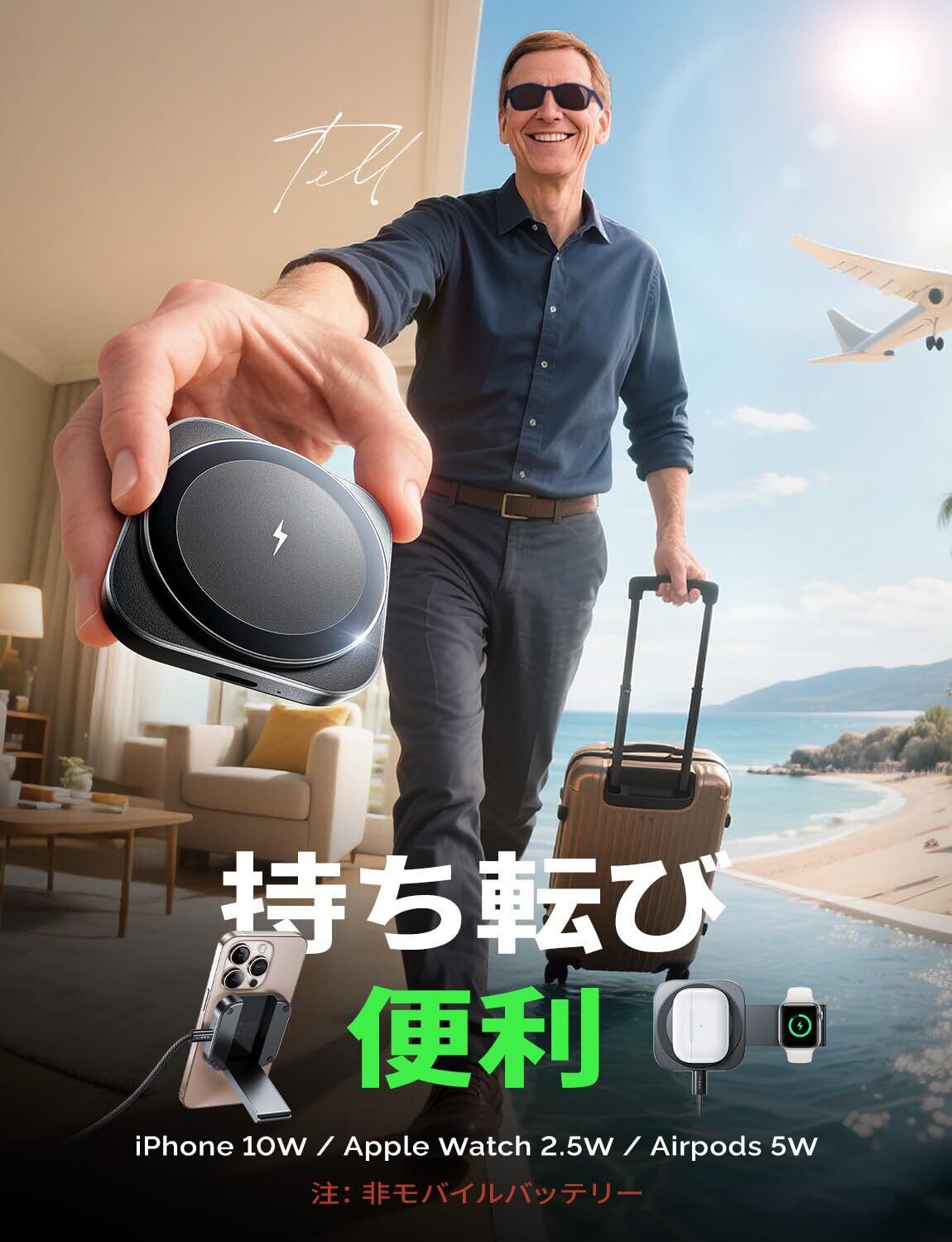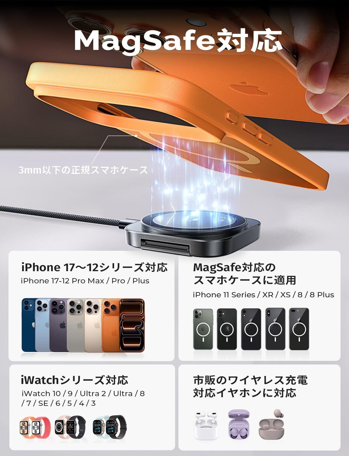 【2-in-1 マグセーフワイヤレス充電器】対応入力 5V/3A・9V/3A,携帯 5W/7.5W/10W(iPhone 最大 7.5W)、腕時計 2.5W,2-6mm 距離で充電可。iPhone12-15 と Apple Watch を同時無線充電,家 / オフィス / 旅行 / ホテル / 会議室多場面活用。電線乱れ解消でスペーススッキリ,忙しい日常も手軽充電。高温時自動降速(7.5W→3W),別売 18-45W アダプターを推奨し効率充電。