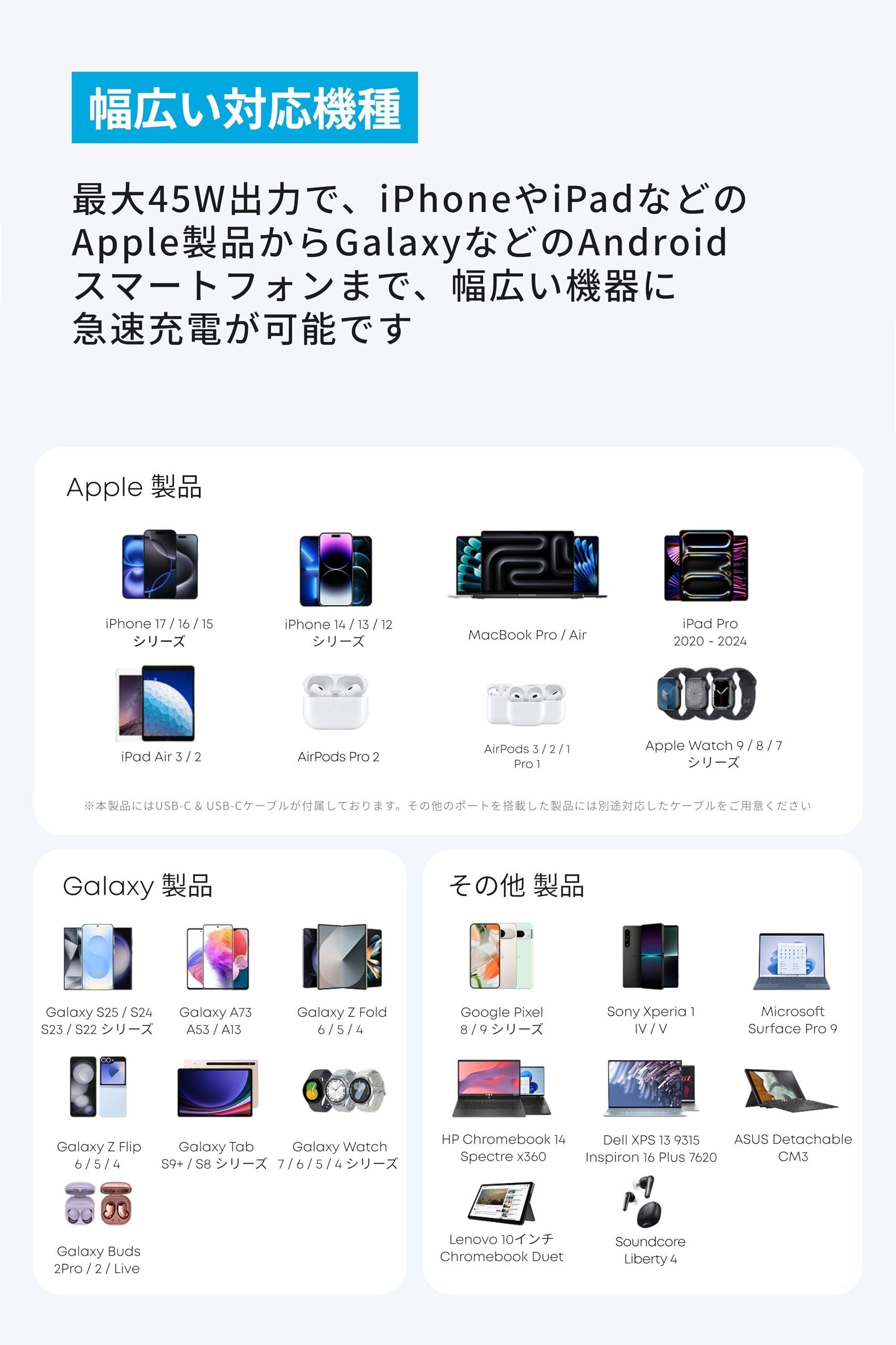 幅広い対応機種:最大45W出力で、iPhoneやiPadなどのApple製品からGalaxyなどのAndroidスマートフォンまで、幅広い機器に急速充電が可能です。