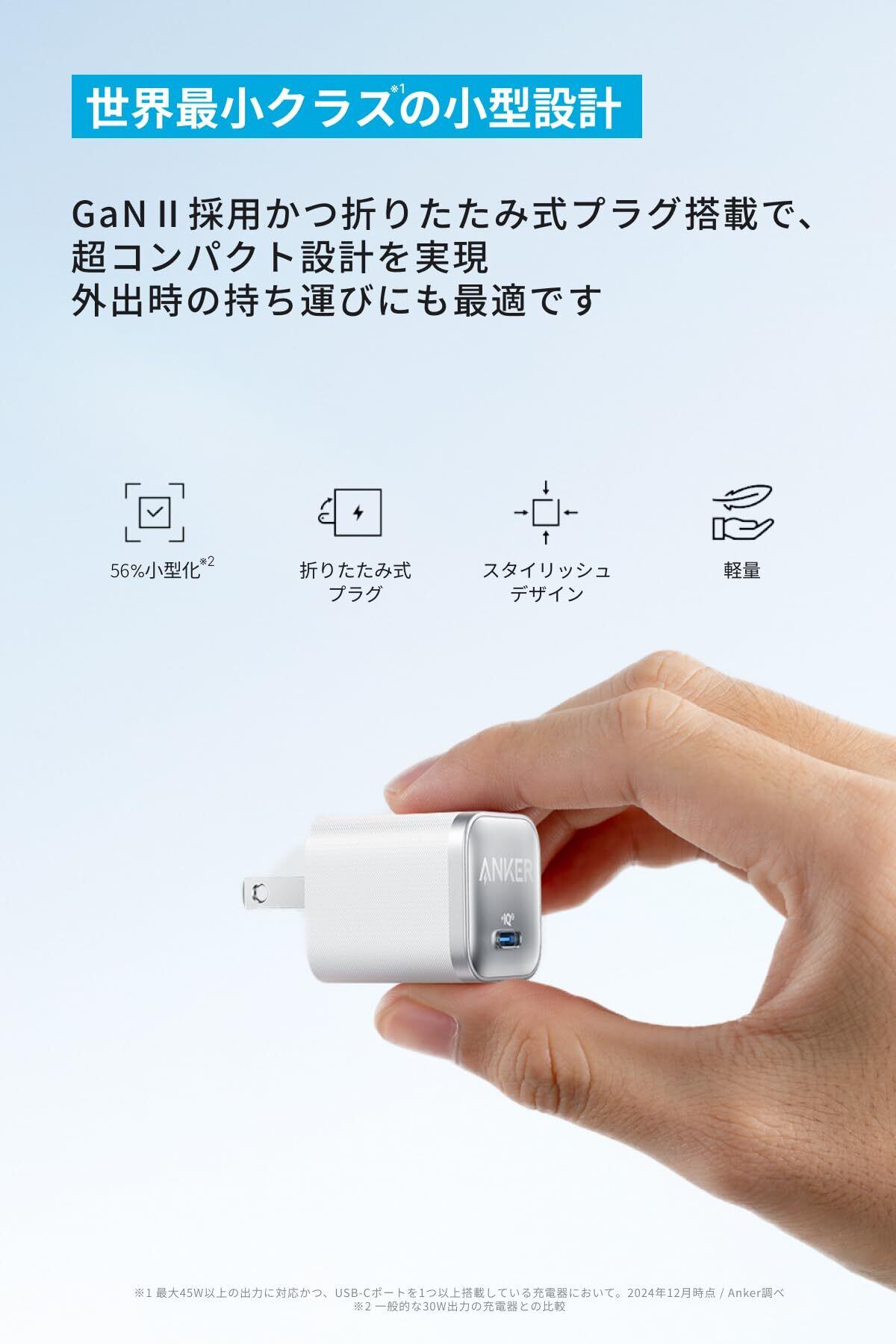 折りたたみ式プラグ搭載の超コンパクト設計:一般的な30W出力の充電器と比較して約56%の小型化を実現。折りたたみ式プラグ搭載モデルで持ち運びにも最適です。
