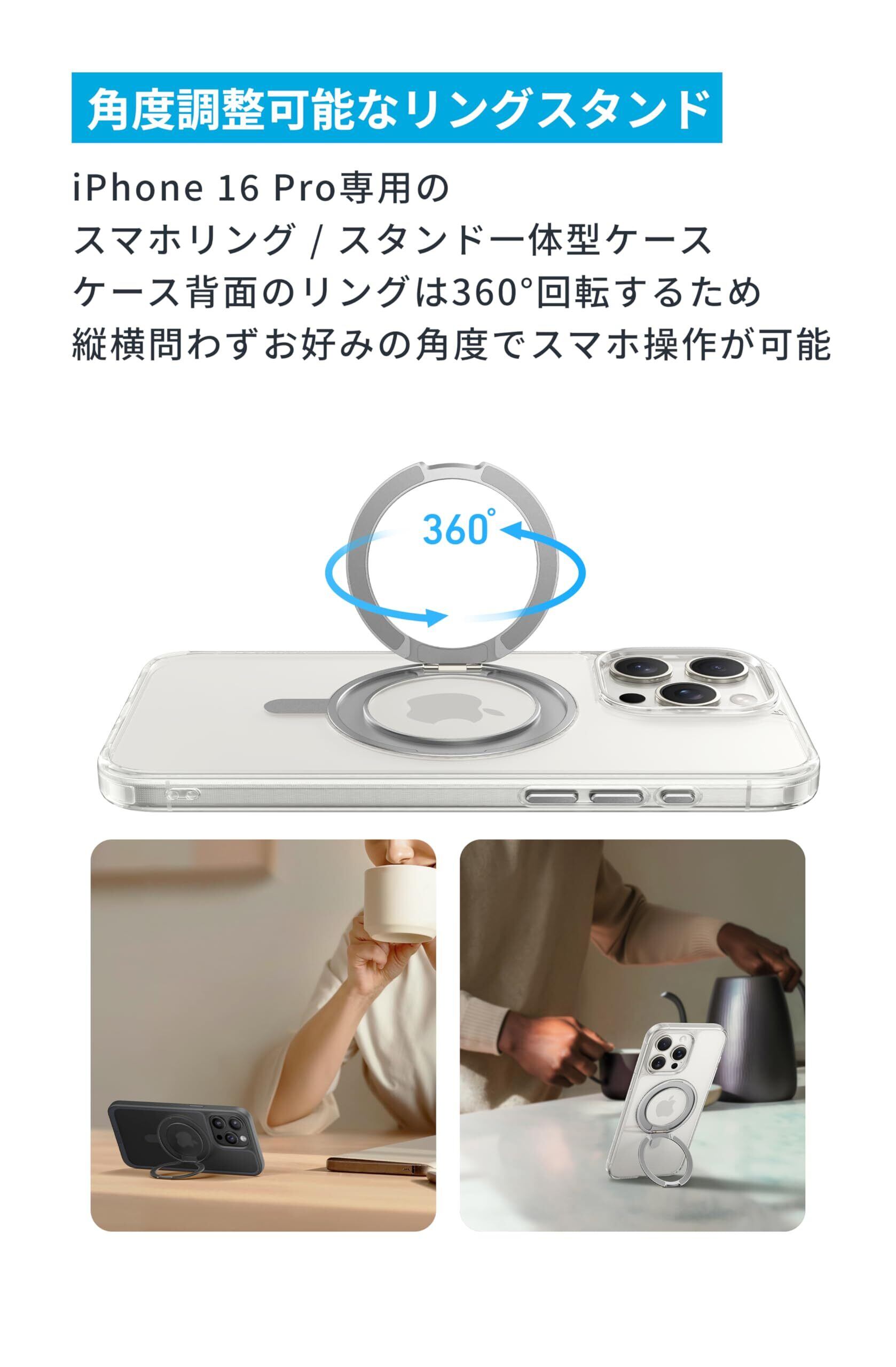 Anker MagGo Magnetic Case (360°リングスタンド, iPhone 16 Pro用) クリア MagSafe対応 リングスタンド付き スマホケース マグネット搭載/滑り止め / 360°落下保護/耐衝撃/高耐久性/黄ばみなし/米軍MIL規格/強磁力リング/隠し収納式 ワイヤレス充電対応