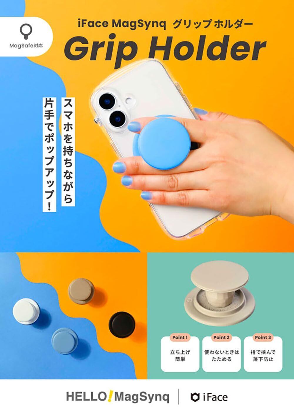 スマホを持ちながら片手でポップアップ!iFaceのMagSynqシリーズからMagSafe対応のグリップホルダーが登場しました。ポップアップ部分を収納すればスリムに持ち運べ、デザイン性も利便性も兼ね備えたアイテムです。