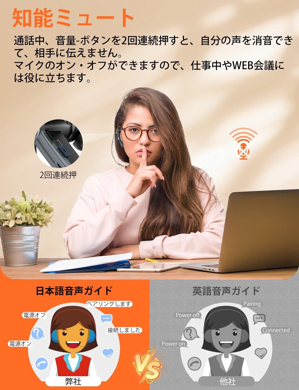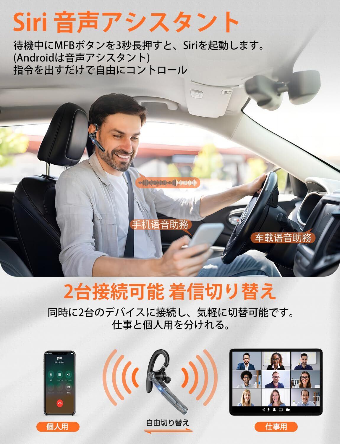 【特化した単一指向性マイク&CVC8.0ノイズキャンセリング・ハンズフリー通話】Bluetoothヘッドセットは単一指向性のマイクを採用しており、他の音のみを拾うためので、複数人の会議やビジネスチャットが順調に進行できます。又、にはCVC8.0ノイズキャンセリング技術搭載され、通話中の雑音や周囲のノイズを抑制し、相手の声を聞き取りやすく快適な通話を実現します。更にマイクブームは6.5cmの長さでお好みの角度に調整して口元に近づいて自分の声だけを相手側にクリアに届ける。マイクブームは上下180°に回転ができ、かつイヤーフック部分に180°回転できるので、左右どちらの耳に快適な装着感を提供します。