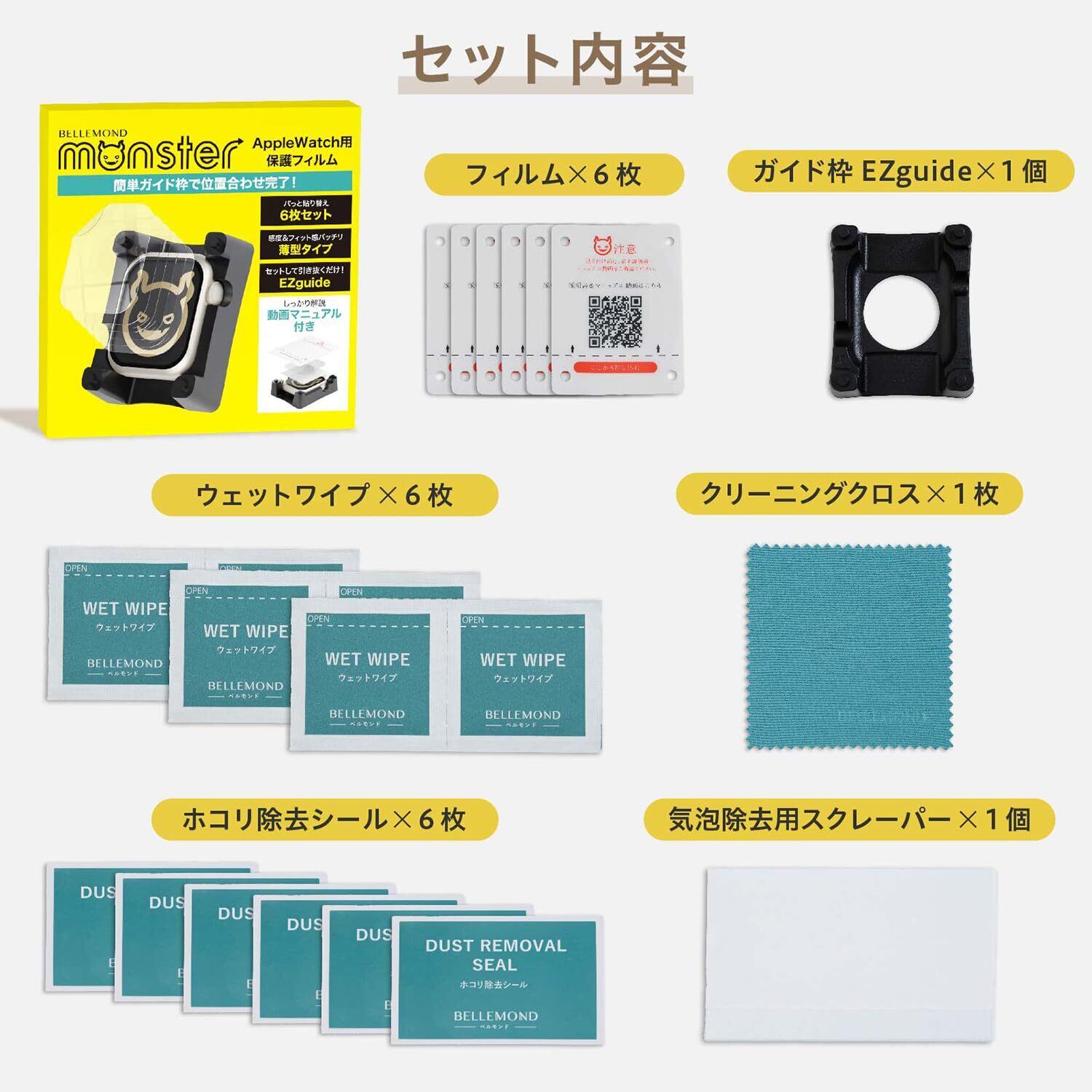 ▶▶▶【対応機種】:40mm(Apple Watch SE3 / SE2 / SE / Series6 / Series5 / Series4 用) ※シリーズ・サイズは時計本体裏面の表記で確認できます。【セット内容】:フィルム × 6枚、ガイド枠 × 1個、 拭き取りシート × 6枚、ホコリ除去シール × 6枚、クリーニングクロス × 1枚、スクレーパー(ヘラ) × 1個 【貼り付けマニュアルについて】:貼り付け方法は動画をご準備しておりますので、「モンスターフィルム AppleWatch用 貼り付けマニュアル」をご覧ください。