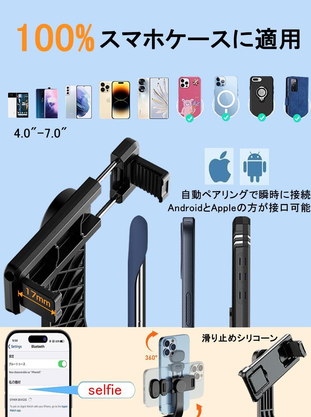 【多機種対応】この自撮り棒は、iPhone 6から17シリーズの全機種はもちろん、Androidスマートフォンにも幅広く対応しています。ホルダーは幅6cm〜9cmのスマホにフィットし、画面の小さな端末でも大画面の最新モデルでも、ガタつくことなくしっかりと固定できます。また、ホルダーの内側には高品質な滑り止めシリコン素材が使われており、スマホの落下を防ぐだけでなく、本体にキズが付くのを防止。撮影中にスマホがズレたり、ホルダーから外れてしまうような心配もありません。
