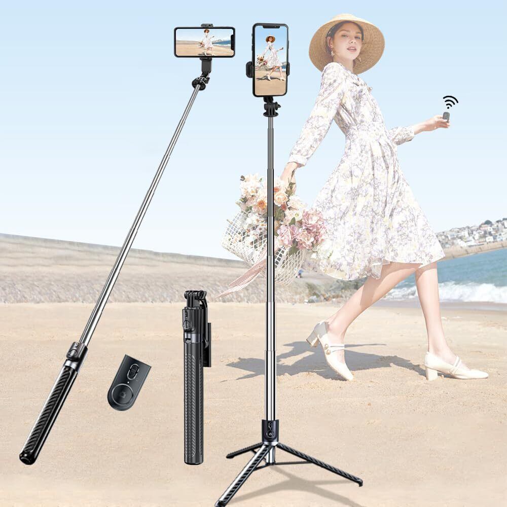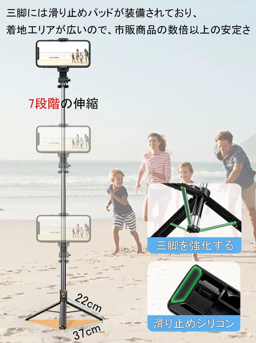 【自撮り棒&三脚でさらに多機能 】 本製品は、7段階の伸縮構造を採用しており、最大で168cmまで伸ばすことができます。さらに、スマホホルダーとスマートフォンを装着した状態では、撮影時の高さは最大約180cmに達し、目線より高いアングルからの撮影も可能です。集合写真やイベント、屋外での風景撮影などでも、しっかりと全体を写せます。収納時はたったの31cmというコンパクトサイズで、リュックやバッグに無理なく収まります。三脚の脚を広げたときの間隔は約37cmで、地面との接地面積が広く、抜群の安定感を発揮します。風のある屋外でもしっかり自立し、ブレのない撮影を実現します。スマホホルダーは、左右360°、上下270°の回転に対応しており、あらゆる角度から自由自在に調整が可能です。風景を大きく撮りたい時や、自分のベストアングルを探したい時にも最適。