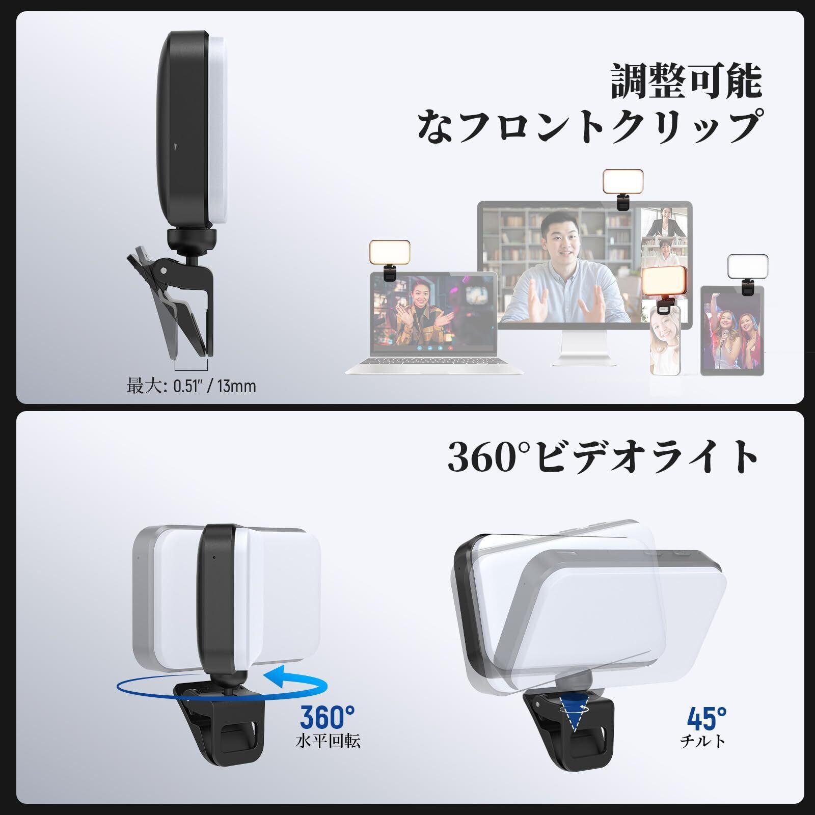 【コンパクト設計&小型軽量】 NEEWER N8クリップ式ビデオライトは超小型ボディ(85×94×18mm)で、重量は約55gと超コンパクト。スマホ・ノートPC・デスクトップPCなどへ簡単取り付け可能で、肌を美しく見せ、見た目を向上させる効果を発揮します。自撮り・Vlog撮影・ビデオ会議・ライブ配信に最適です。ボールジョイント搭載クランプは全方向調整(360°回転+チルト)が可能で、多様な照明角度を実現します。