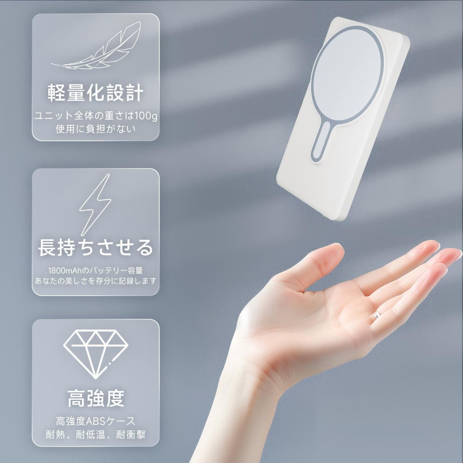 【快適デザイン!軽量・耐衝撃・長時間使用可能】 超軽量 100g でコンパクト設計,バッグに収納しても負担にならず、持ち運びに最適。 強力マグネット機能によりスマホ背面にしっかり固定,落下を防ぎ安心。 高品質耐衝撃材質 + IP54 防塵防水設計で、アウトドアでの使用にも耐え、長期使用に対応。 内蔵バッテリーで最大 4 時間連続使用可能,過充電防止・過熱自動停止機能搭載で、安全かつ安心してお使いいただけます。