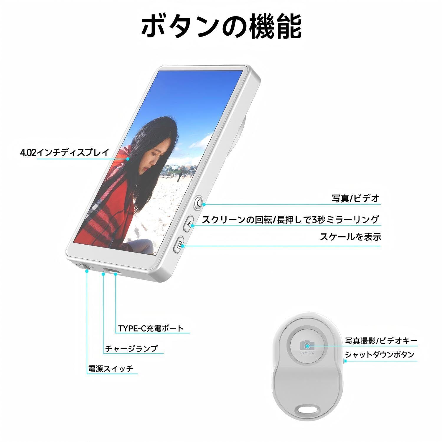 【高規格仕様!4.02 インチ Full HD 画面 + 広範囲互換】 4.02 インチ HD 画面(1920×1080 解像度)+ 1080P フル HD 対応(ワイヤレス接続時)で、高品質な映像表示を。 WiFi 接続(50 メートル遠隔確認)と Bluetooth リモートコントロール(15 メートル操作可能)を搭載,接続の自由度が向上。 互換性に優れ、iOS9.0 以上、Android 2.0 以上、HarmonyOS 3.0 以上、MagicOS 4.0 以上の多機種に対応,ほとんどのスマホで使用可能です。