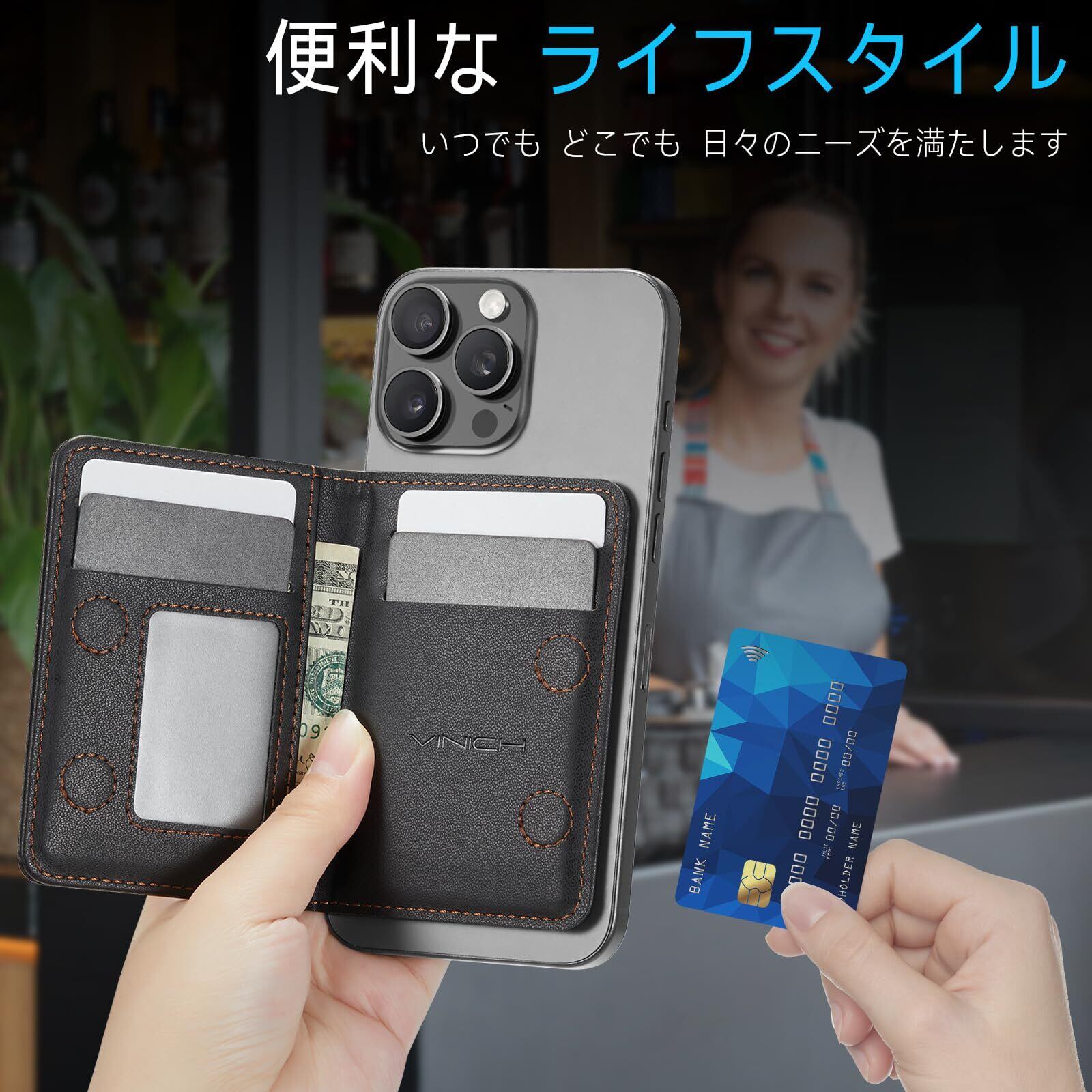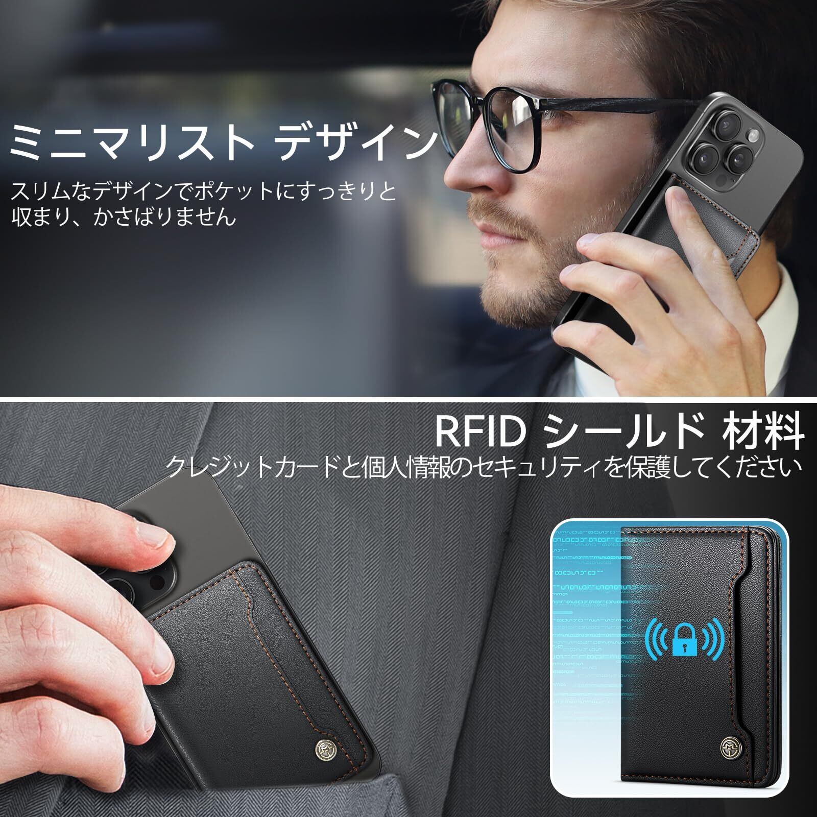 RFID ブロッキング機能付きカードホルダー:RFID ブロッキング機能を備えたこの磁気式スマホウォレットは、カードの情報が盗まれるのを防ぐよう設計されています。