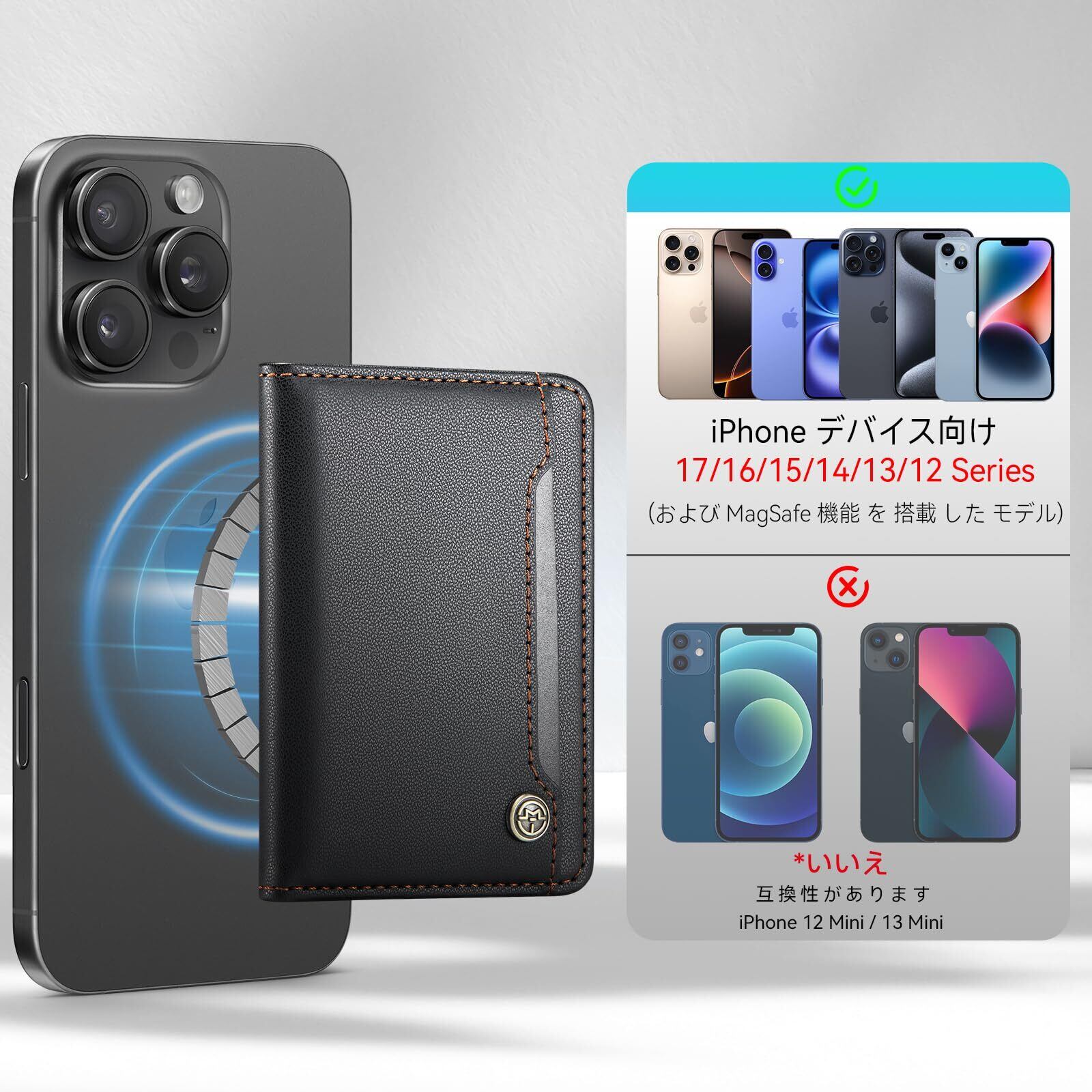 MagSafe 対応:ウォレットに内蔵された磁石により、この磁気式ウォレットは MagSafe 対応のスマホやケース(iPhone 16/15/14/13/12 シリーズ向け)に適合します。